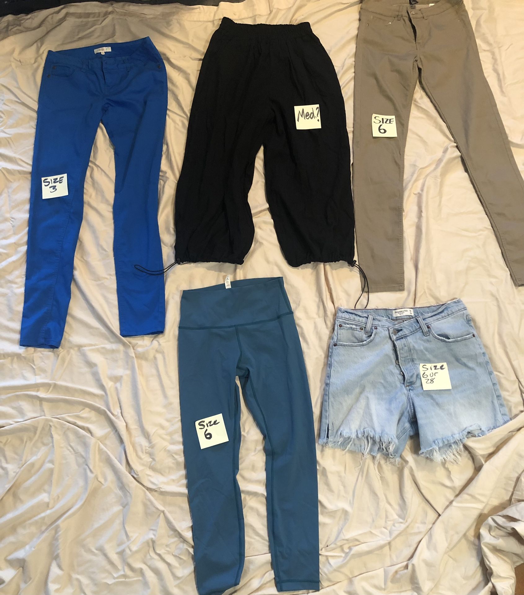 New item: beige pants All others 1x use or light use. Jean Shorts has one foundation makeup stain that won’t wash off where pen is pointing at All items $4. Lulu lemon teal pants $20