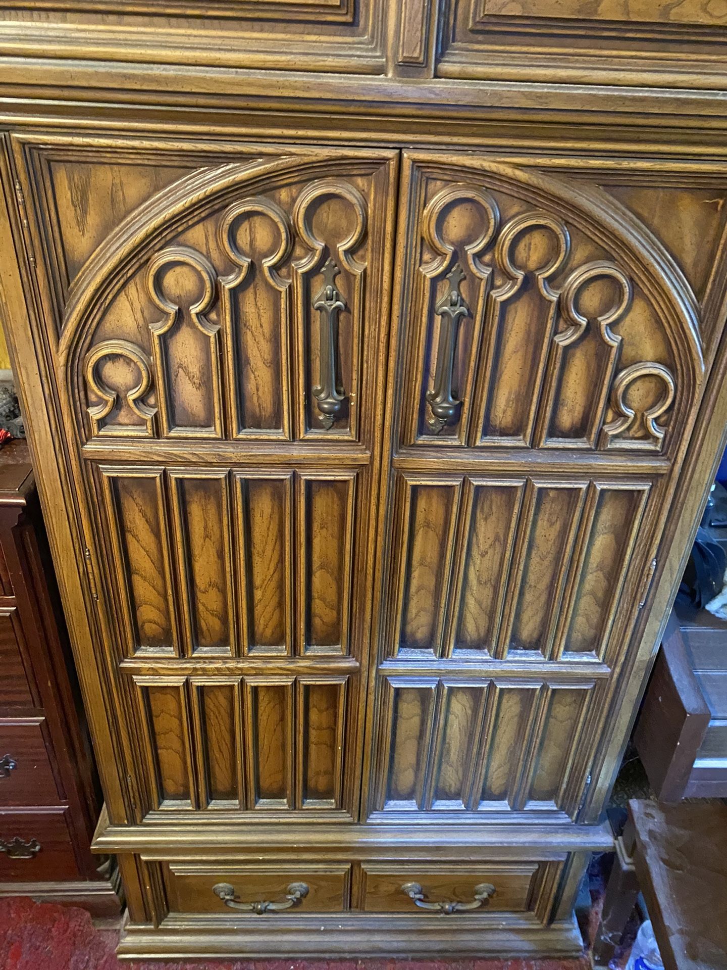 Solid wood and metal handles. Great condition with ornate Spanish carvings. Very heavy and would need at least two people to move. It is 76.5” high 37” wide and 18” deep.