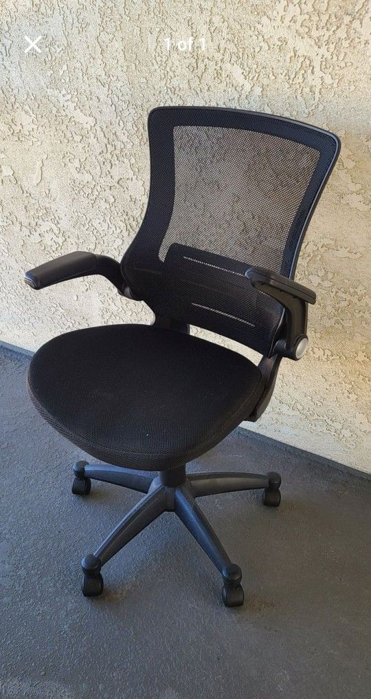 Office/Manager chair, fabric base with ventilated back, adjustable height/recline, armrests fold up. Very lightly used, been stored away (retailed for $149 at Costco)