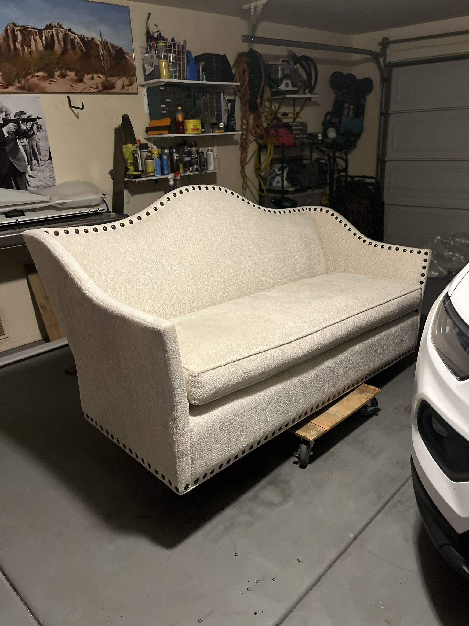 Ethan Allen Camelback Settee Sofa Traditional rolled-arm, nailhead trim, attached back, bench seat with retention loops Approx. 71” wide