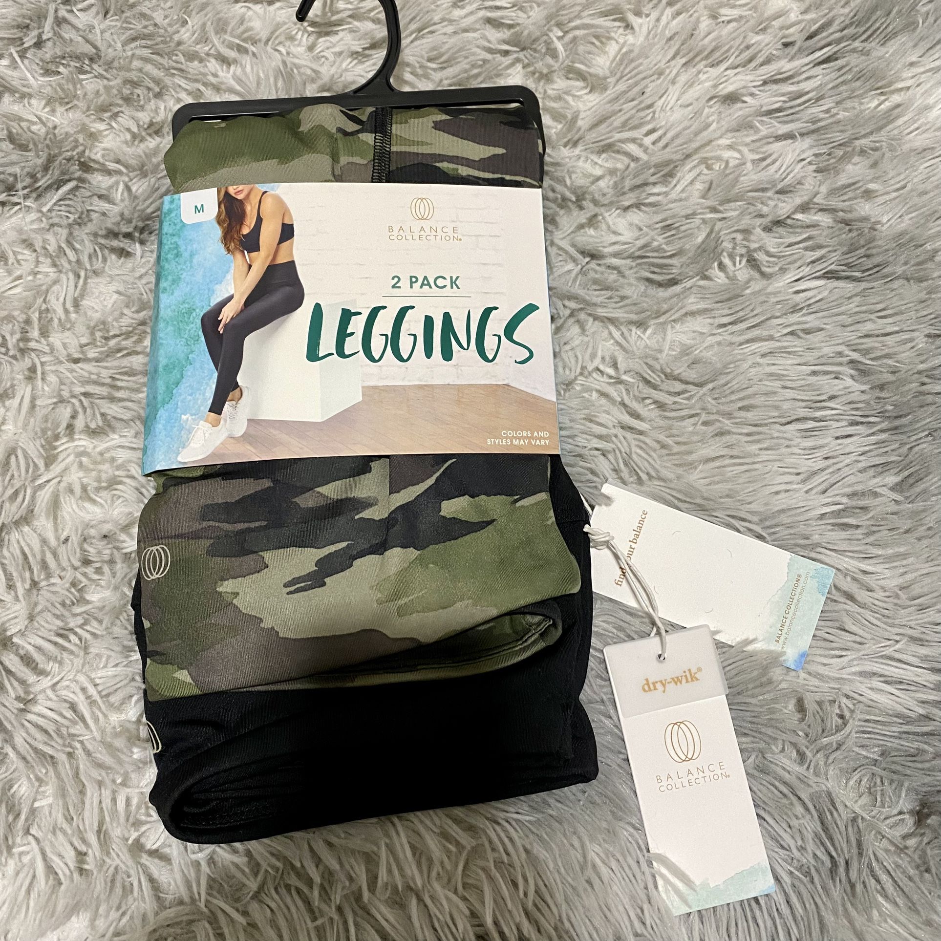 Balance Collection Women’s 2 Pack Leggings Watercolor Camo & Black New with tags Size medium and large available Medium 8 / 10 - 29 - 30 waist Large 12 / 14 - 31 - 32 waist
