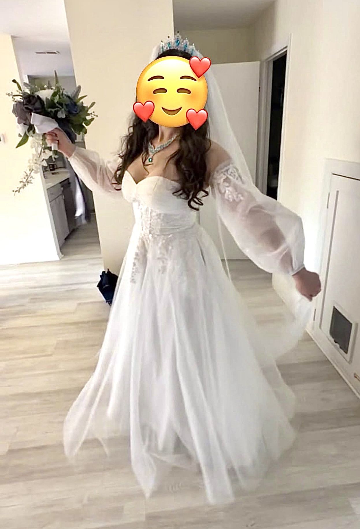 Beautiful soft white wedding dress. Size 8. Sleeves are not attached to the dress, you can either put them on or keep them off. They will be in the dress bag as well as a matching vail. Everything is a set- sparkling, white, fluffy, beautiful. You will be the best bride ever! Look no more, come pick up or pay for shipping - size 8, it’s basically between medium and large :) I just wore it for my wedding and was so happy with it- no problem all day long. Great dress, cheap price. I bought it brand new in the store for a $1000 in December 2025 - so it’s great deal. Dress + sleeves $249 Vail - FREE Also, selling the bouquet for $20 if interested
