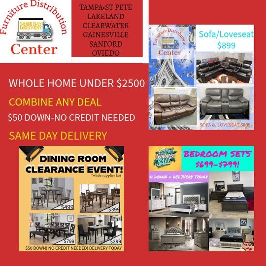 FALL BLOWOUT SALE!!! IN STOCK!!! SAME DAY DELIVERY!!! NO CREDIT NEEDED FINANCING! LOWEST PRICES!! COMFY NEW SANTIAGO, MADRID OR BARCELONA RECLINING SOFA AND LOVESEAT SET ON SALE ONLY $899. RETAILS $1999. LIMITED STOCK! ONLY $50 TO START WITH ACIMA! TEXT 71018 TO 22462 TO APPLY NOW! ORDER BY PHONE OR VISIT A SHOWROOM TODAY!! With these prices you can do whole home under $2500 pick any sofa set. It’s pretty good! ☎️ ORDER BY PHONE (352)420-0506 THE OAKS MALL (INSIDE MALL ACROSS FROM FOOD COURT) 6455 W NEWBERRY RD GAINESVILLE 32605