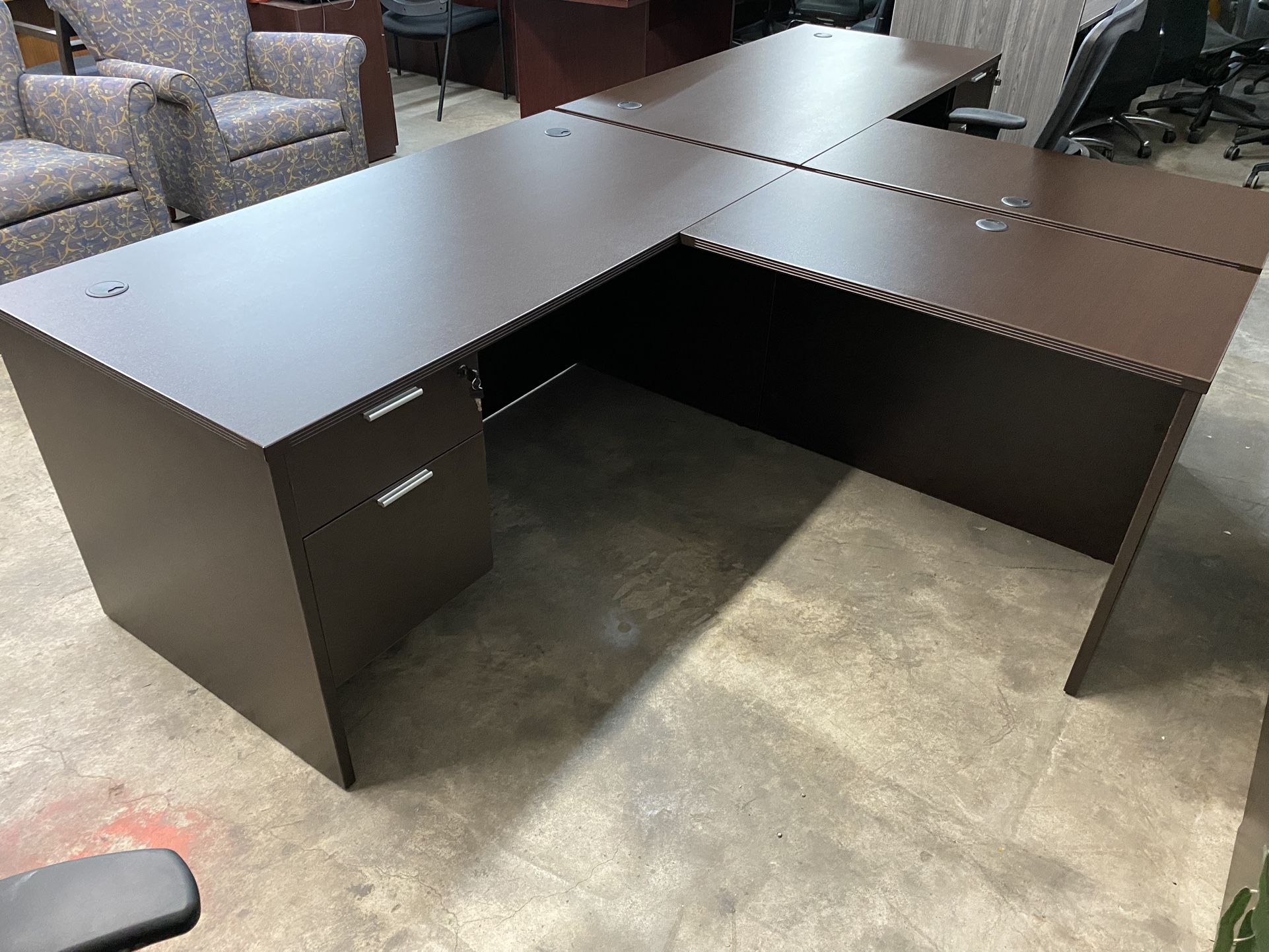 Single cabinet L shaped desk, commercial grade, laminate in espresso finish, 1 cabinet with lock, wire grommets, 5’ front x 6’ left side
