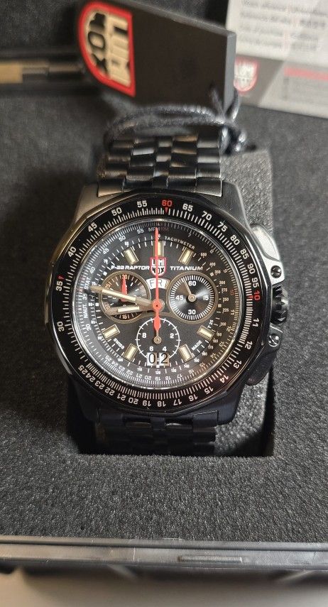 Luminox Light TechnologyLuminox Light Technology is a system of self-powered micro gas light tubes installed in the hands and hour makers. These micro-gas tubes are designed to glow for up to 25 years in any light condition, ensuring unparalleled visibility and reliability. Swiss Quartz ChronographThe chronograph sub-dials are incredibly legible, and easy to read at a glance at any time of day or night, thanks to the Luminox Light Technology built into the dial and the hands. MaterialsDurable and sustainable, Luminox timepieces are forged with purpose. Luminox uses various innovative materials from strong and resilient carbon compounds to high-grade 316L stainless steel and ultra-lightweight https://offerup.com/redirect/?o=dGl0YW5pdW0uQ2FzZQ== backPaying homage to the juggernaut Lockheed Martin and their engineering prowess, the titanium, screwed-in, case back has a meticulously etched image of the F-22 Raptor aircraft that inspires this remarkable timepiece. Features:Brand: Luminox Collection Name: F22 Raptor Model #: XA.9272 Case Material: Titanium Case Thickness: 16 mm Case Diameter: 44 mm Bezel: Bi-Directional Movement: Swiss Quartz Crystal: Sapphire, crystal with anti-reflective coating Dial Color: Black Luminous: Hour & Minute Markers Calendar: Day & Date Functions: Hour, Minute & Second Chronograph: Yes Bracelet Material: Titanium Bracelet Width: 24 mm Clasp Type: Deployant Water Resistant: 200m ( 660 ft )