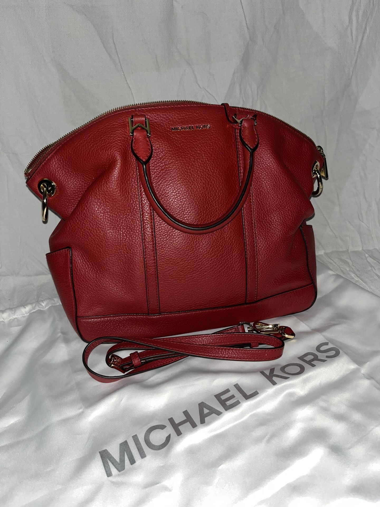 Stylish soft red leather Michael Kors handbag with detachable shoulder strap. Very clean and taken care of. Includes dust cover.