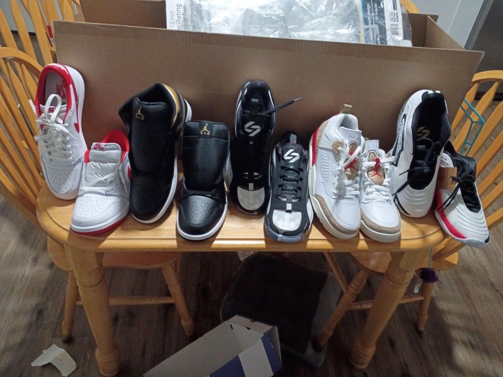 2 pair of the Luka 3z size 11, 2 pair Retro Jordan Ones,r ed and white- size 11.5 the gold and black retros are size 12. Jordan Spzike desert camel and red size 11.