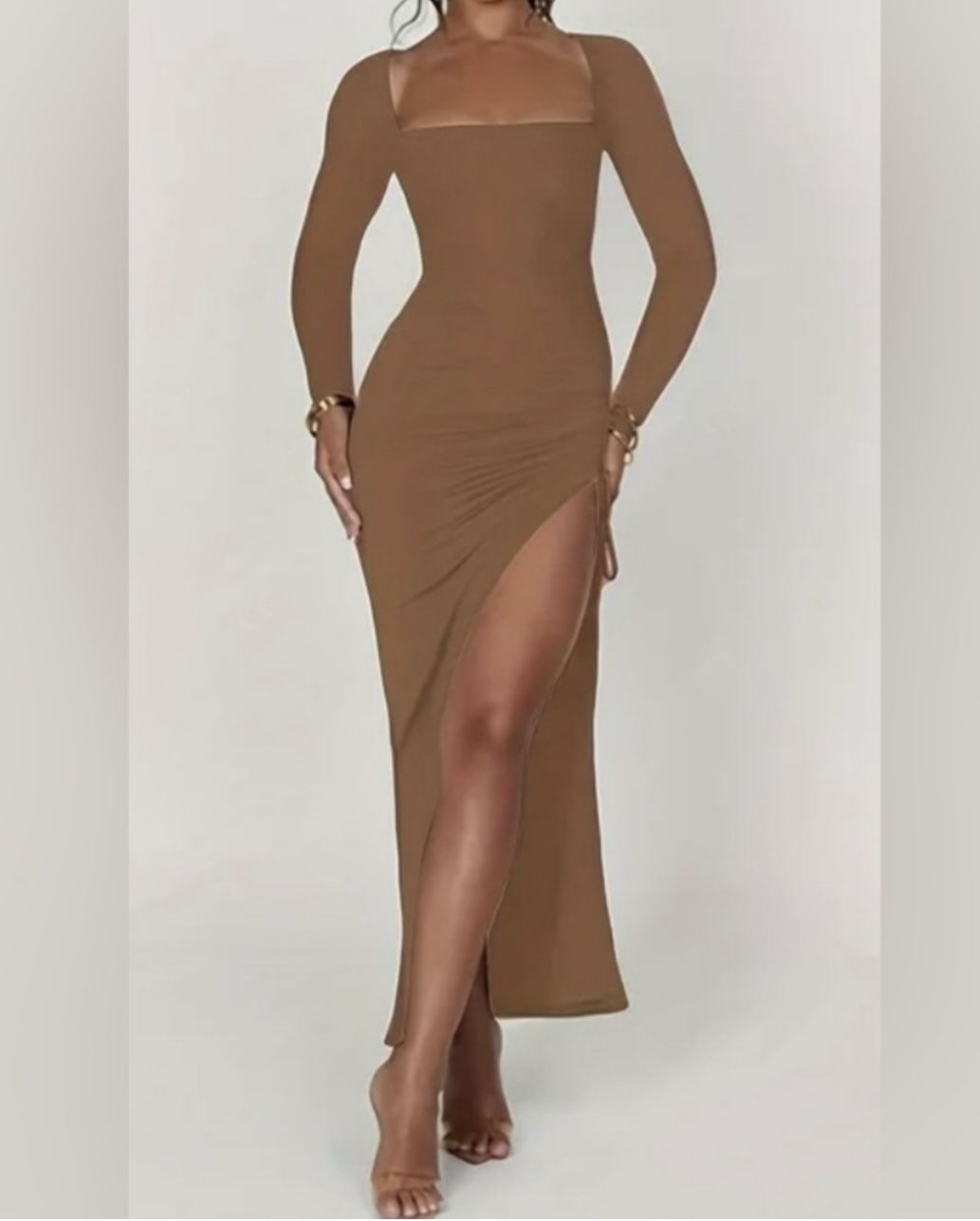 Elegant Brown Long Sleeve ,Maxi Dress and open leg Step out in style with this elegant brown long sleeve dress. Perfect for any occasion, this dress features a chic design with a flattering fit. Ideal for adding a touch of sophistication to your wardrobe. Bought on TikTok