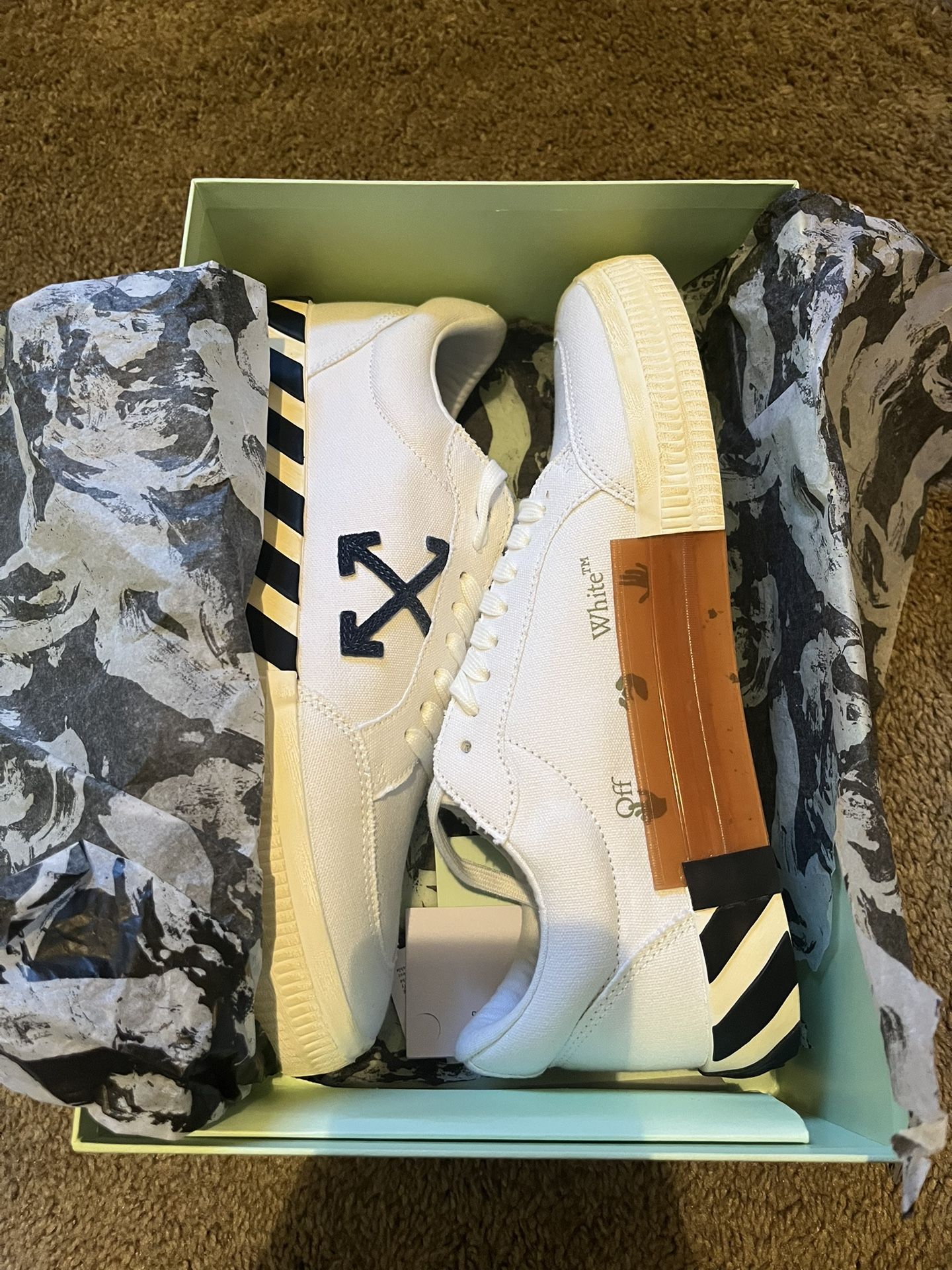 Off-White low vulcanized eco canvas white navy blue sneakers. Size is non-standard, but fits US shoe size 10-11. New, never worn.