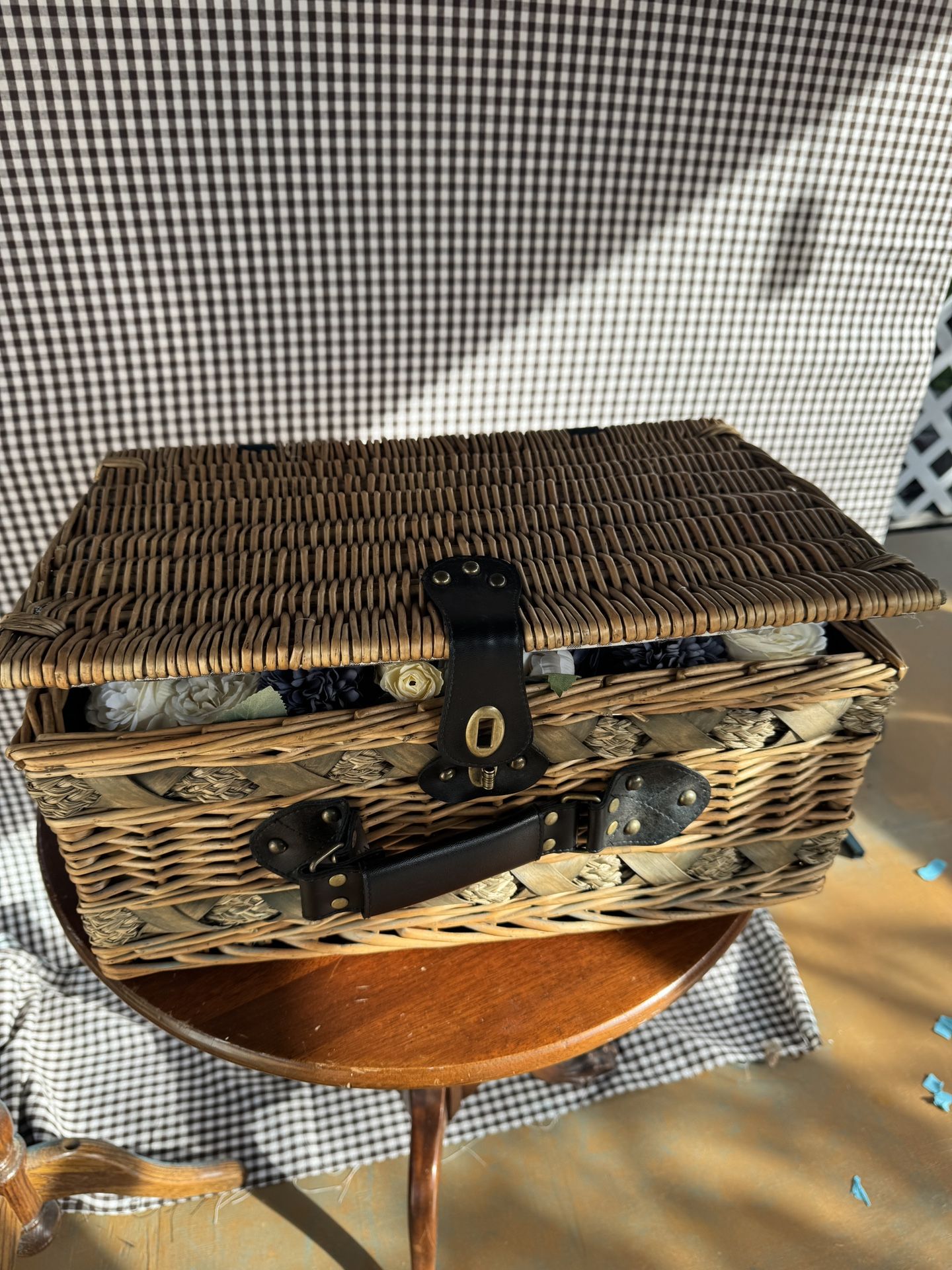 Cute vintage basket, lined with brown gingham fabric flowers not included