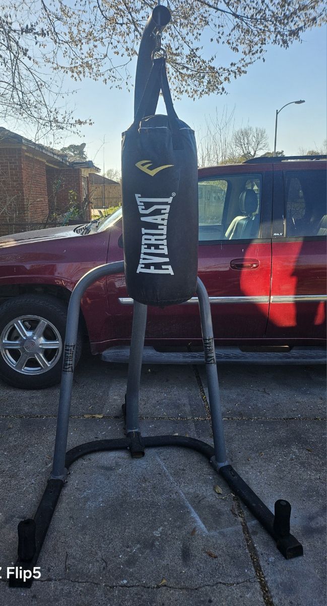 estación de entrenamiento Everlast que incluye un saco de boxeo pesado suspendido en un soporte de acero. 77016 Everlast training station that includes a heavy punching bag suspended on a steel stand.