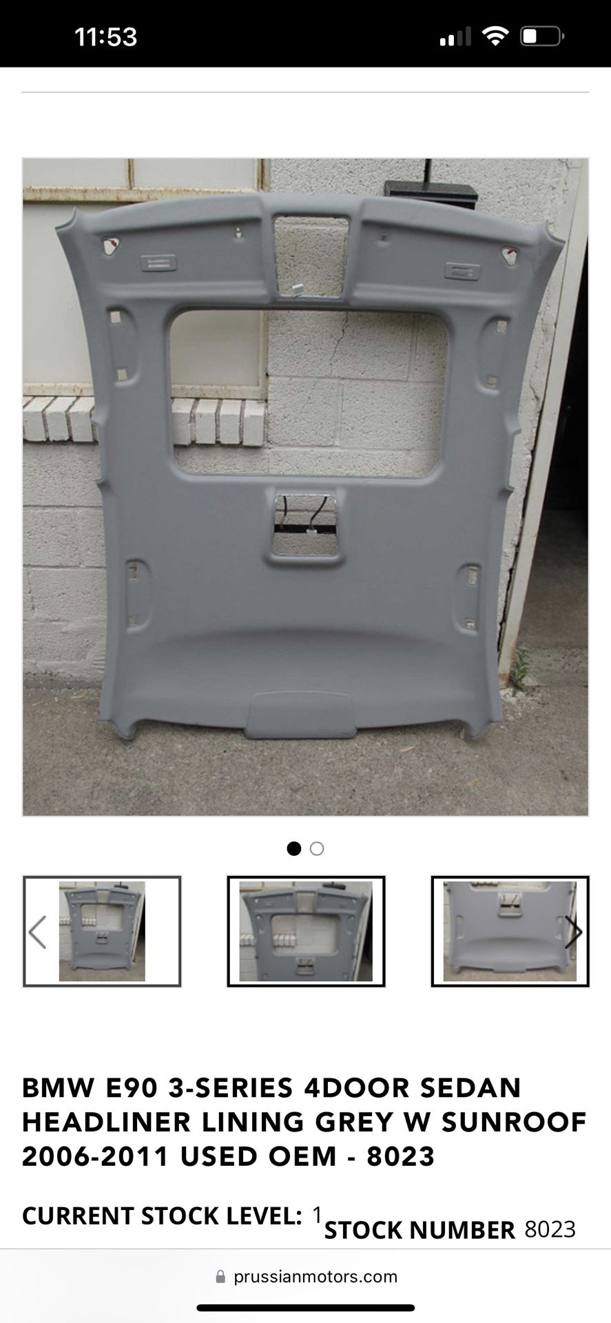 BMW E90 3-SERIES 4DOOR SEDAN HEADLINER LINING GREY W SUNROOF 2006-2011 USED OEM - 8023 2007 2008 2009 2010 No huge or unclean able stains No lights , sunroof or console included, items can be sold apart if needed