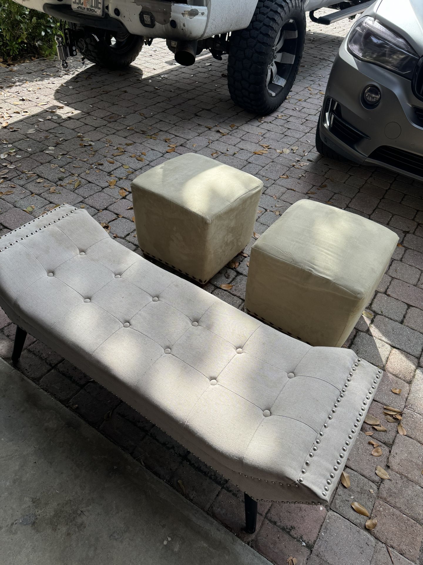 Good condition bench and ottomans. Bench slightly stained, removeable. Need both gone