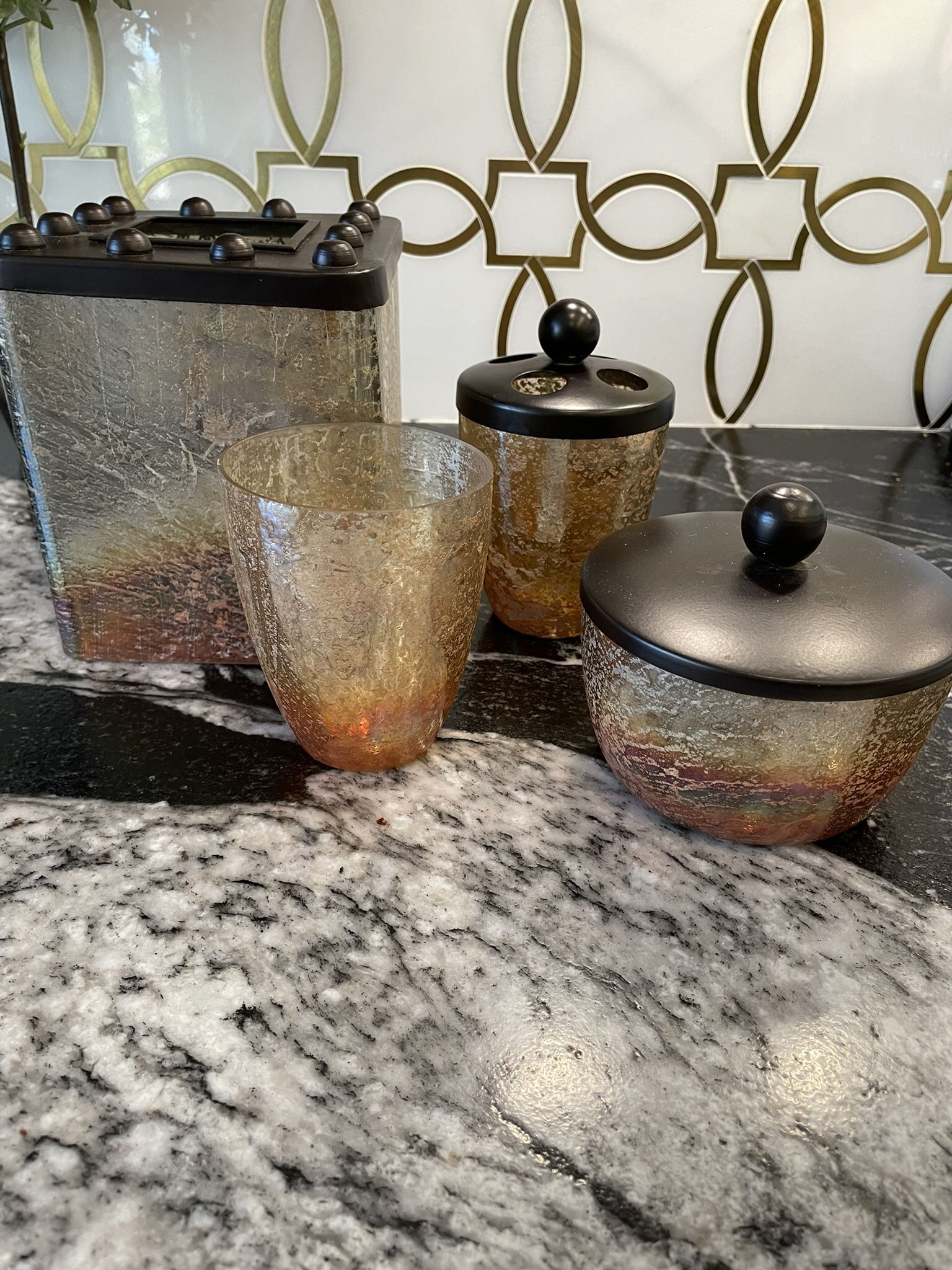 Boutique tissue cover (6” tall x 5.5” wide), toothbrush holder (5.5 x 3.5), canister w/ lid (3 x 5) soap dish/catchall 1.5 x 5.5), lotion/soap pump (7 x 5.5)and tumbler (4 x 3.25) in an oil rubbed bronze finish accenting beautiful art glass in desert shades with a subtle sparkle. All in perfect condition, no chips. $45.00 cash, Venmo, Zelle. Cross streets are Stagecoach Pass and Lone Mountain in far North Scottsdale, not far from Carefree.