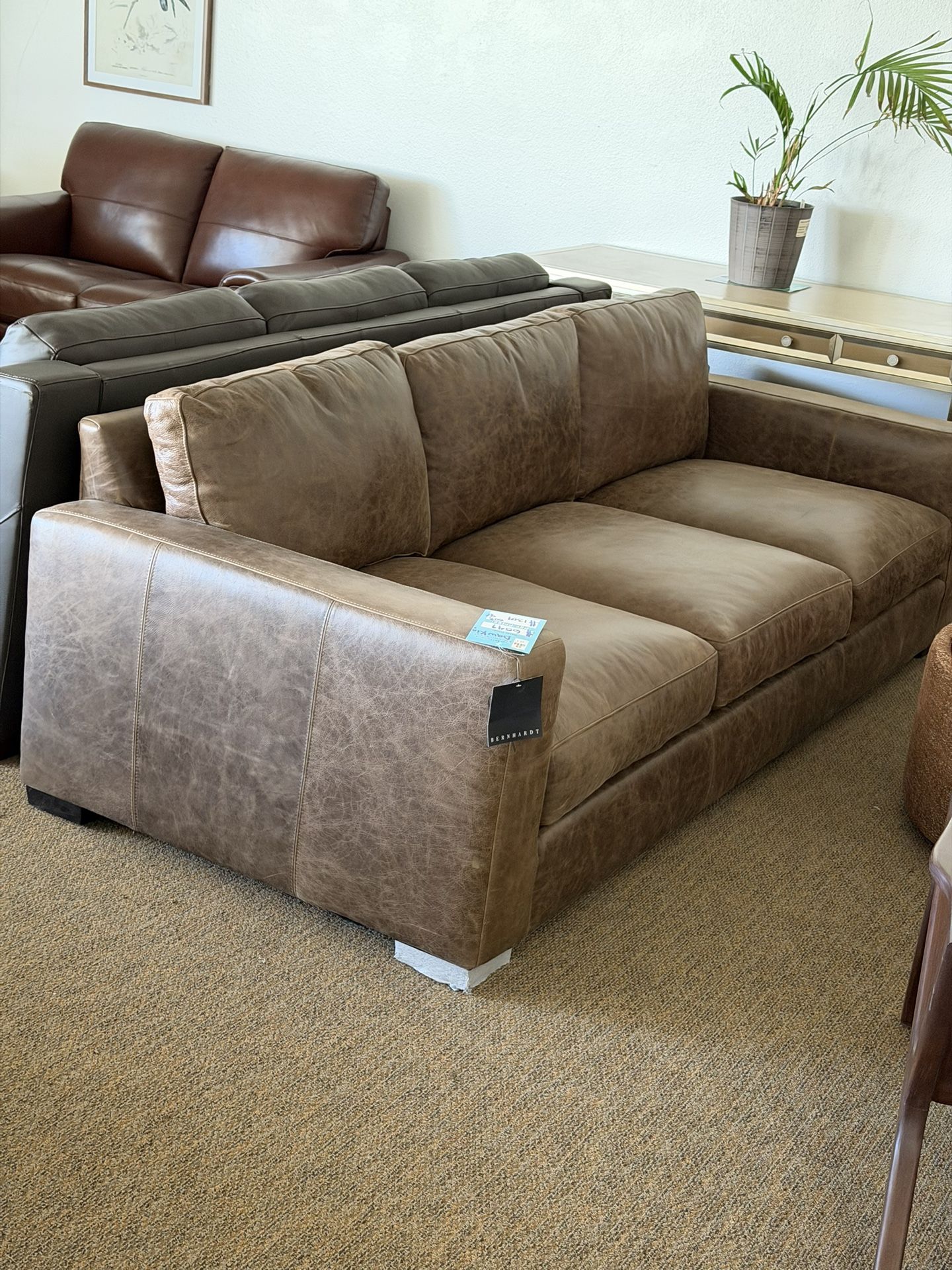 Approx dimensions: 94"W x 40.5"D x 34"H Top Grain Leather Upholstery Removable reversible cushions Wide track arms Financing available -No credit required Delivery available More fabric/leather sofas available in store Store display/open Furniture store location: 68945 Perez Rd Suite 1 Cathedral City Store number: 760-534-8222 JS Furniture and mattresses Open Wednesday through Sunday From:10: 00 to 5:00pm modern furniture, brown sofa, couch, home decor, affordable furniture, quality furniture, discounted furniture, furniture liquidation