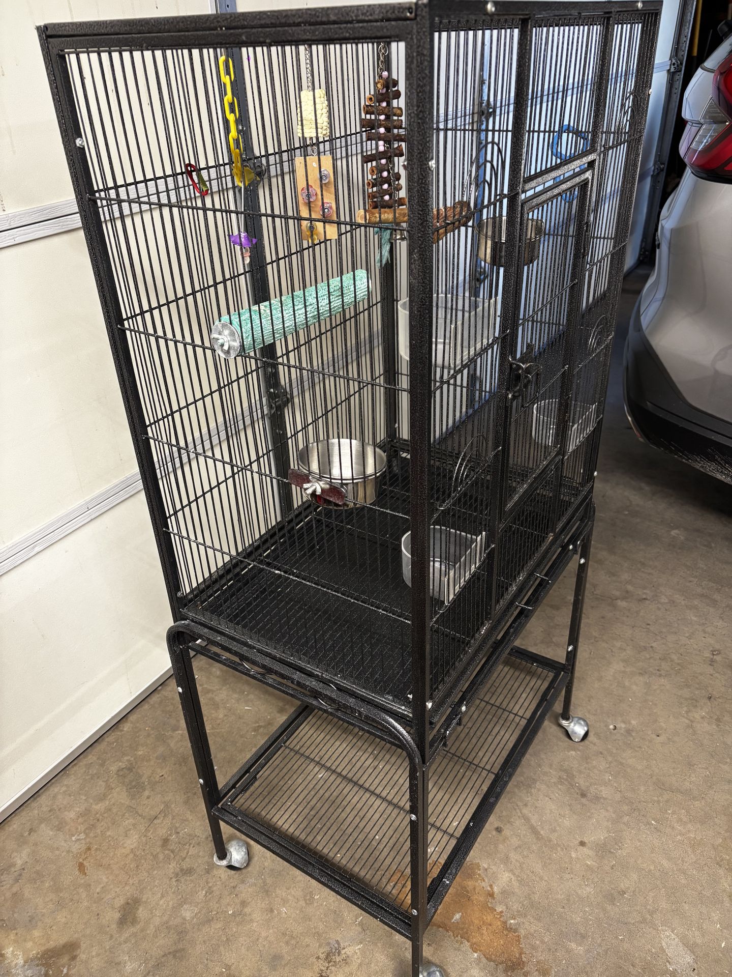 Only used 2 days! Accidently let the bird escapeš¢ Includes all the feeders, Bowls, perches, and toys Cost $180 all together. A steal for $79 Cage is 24" wide, 54" tall with stand ( cage only is 30" tall
