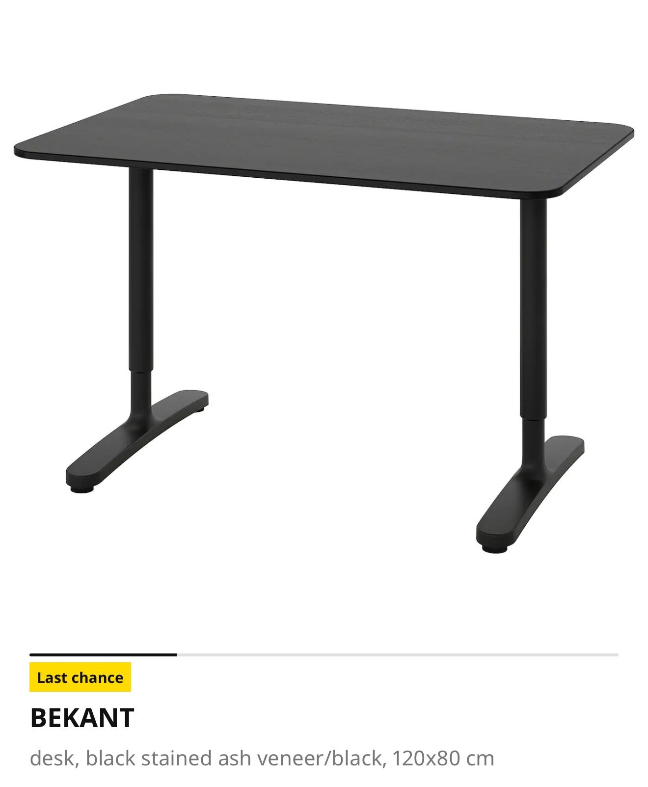 Model: BEKANT Length: 63 Inches Width: 31 1/2 Inches The desk functions great! Stand or sit. Hate to let it go, but have to downsize to something smaller. Desk has minor wear.