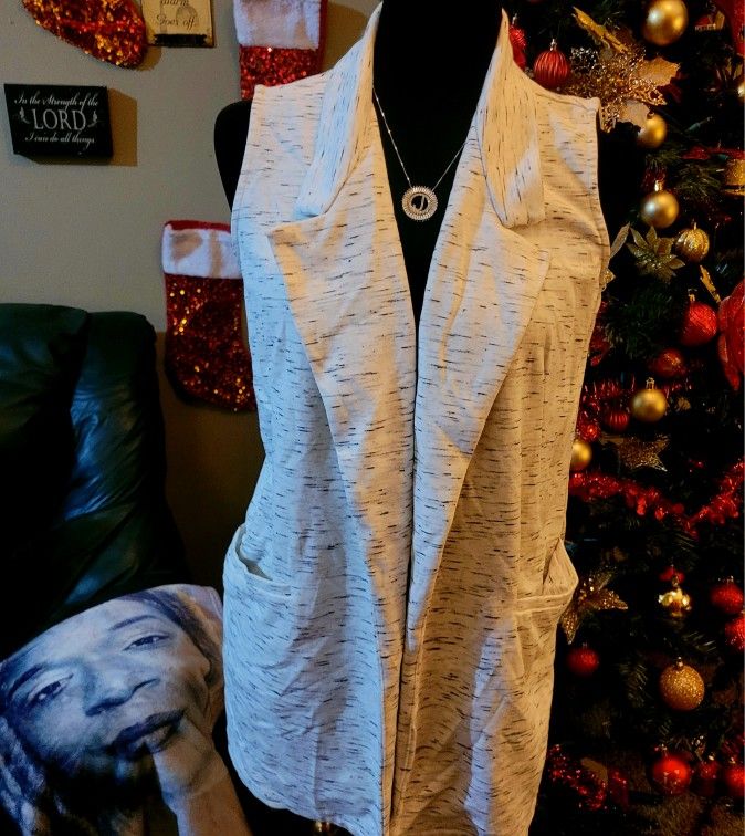 Bobeau Sleeveless Space Dye Jersey Vest Pockets. Notch collar. No closure. Front pockets. Soft fabric. Trendy and super comfortable. Casual long line and relaxed. Size S