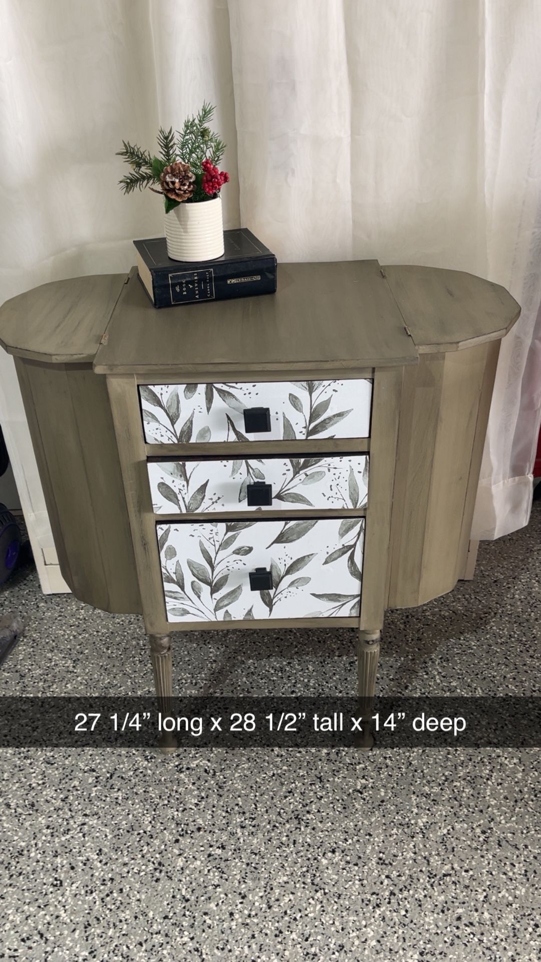Antique solid wood Federal Style Sewing Cabinet, c.1950’s. Fluted legs Antique green Refurbished and ready for its new house
