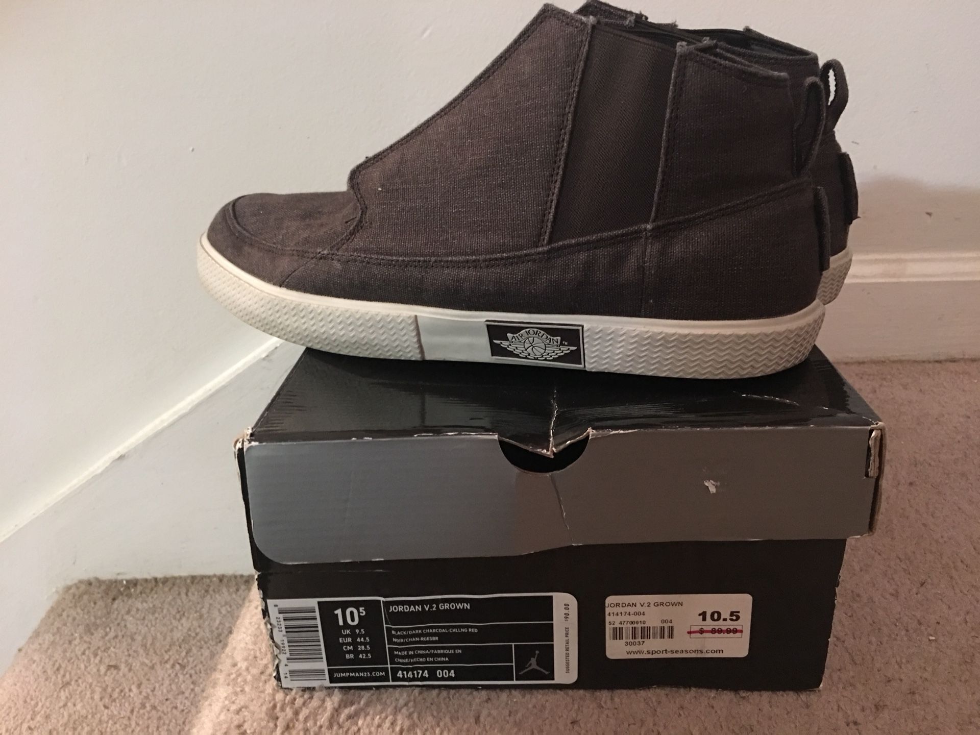 The Air Jordan V.2 Grown •Color: Velvet Brown / Rattan-Golden Harvest •Store Demo Pair •Size 12 *The Air Jordan V.2 Grown is a lighter, sleeker version of the popular Jordan Campus Chukka. They feature a streamlined design with "hidden" laces, an elastic gusset, and they are available in both suede and canvas uppers. This lifestyle sneaker from Jordan Brand is perfect for the relaxing days of summer when you just want to kick back, but still look cool. Plus, they also sport the Air Jordan "wings" logo on the midsole.