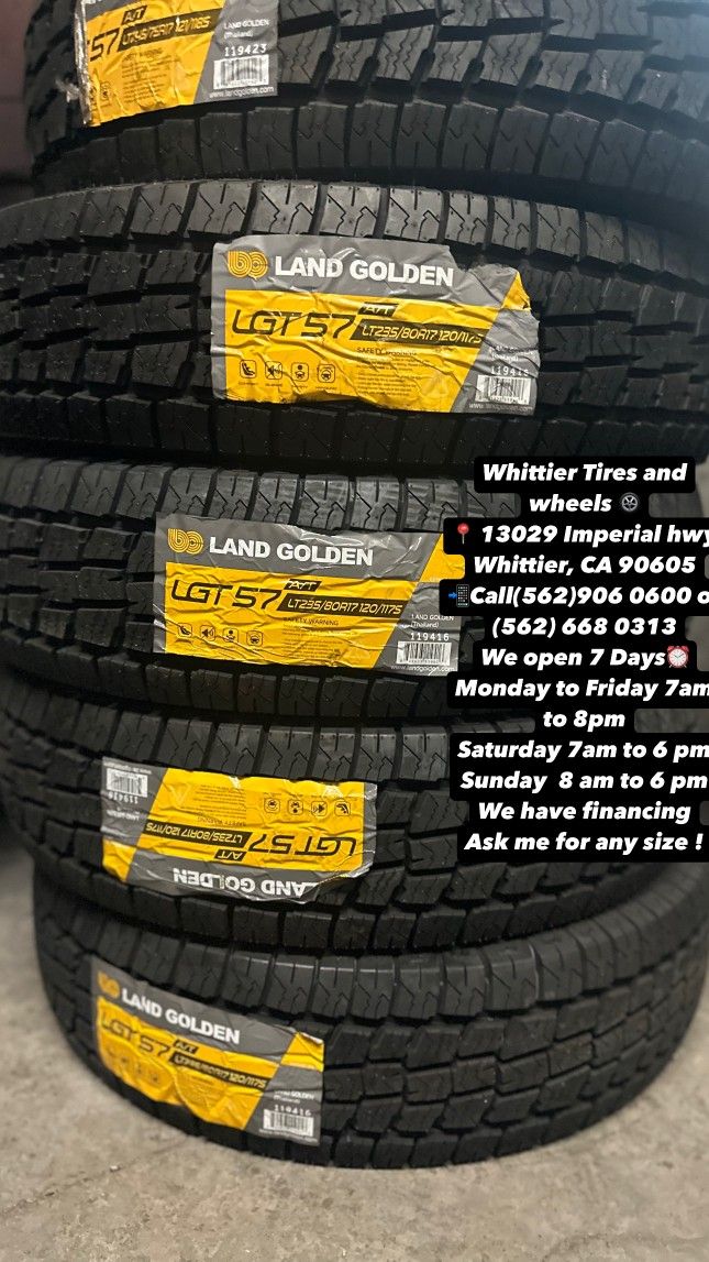 WHITTIER TIRES 13029 IMPERIAL HWY WHITTIER CA 90605 CALL (562)906-0600 TEXT (562)413-6926 - WE HAVE THE BIGGEST USED & NEW TIRE INVENTORY AVAILABLE, ASKS US FOR ANY SIZE YOU NEED. FINANCING OPTIONS AVAILABLE, 90 DAY NO INTEREST! HABLAMOS ESPAñOL. OPEN MONDAY-FRIDAY 7AM-8PM, SATURDAY 7AM-6PM, SUNDAY 8AM-5PM 185/65/14 175/65/15 185/55/15 185/65/15 195/65/15 205/55/16 215/55R16 215/60/16 205/65/16 245/75/16 265/70/16 285/75/16 265/75/16 215/45/17 225/45/17 225/50/17 215/50/17 215/55/17 235/65/17 245/65/17 255/65/17 265/70/17 285/70/17 33x12.50r17 215/45/18 225/40/18 235/40/18 235/45/18 245/45R18 235/60/18 245/60R18 265/60/18 255/70/18 265/70/18 33x12.50r18 225/40/19 235/40/19 245/40/19 245/45/19 245/35/20 245/45/20 245/50/20 255/50/20 265/50/20 275/55/20 275/60/20 33x12.50r20 35x12.50r20 37/13.50R20 265/35/22 285/45/22 305/40/22 305/45R22 33x12.50R22 295/35/34 305/35R24 ESPECIAL DE LLANTA NUEVA Y USADA GOODYEAR MICHELING BRIDGESTONE FIRESTONE CONTINENTAL ARROYO YOKOHAMA PIRELLI KUHMO TOYO ATLANDER LANDGOLDEN LANDSPIDER LLANTAS TIRES WHEELS