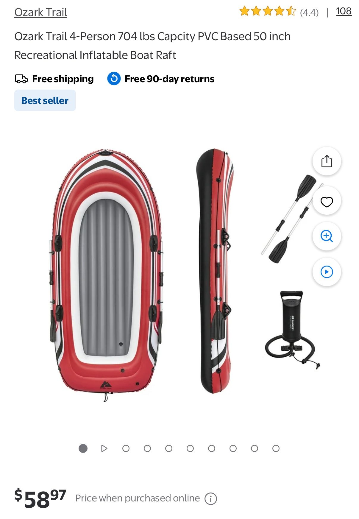 Ozark Trail (Walmart brand) - has been used once! In great condition. Still in original box and does include the hand pump and oars. Holds up to 4 people, weight capacity is 704 lbs. 9ft. 10in x 50in. Pick up only at this time, thank you! :)