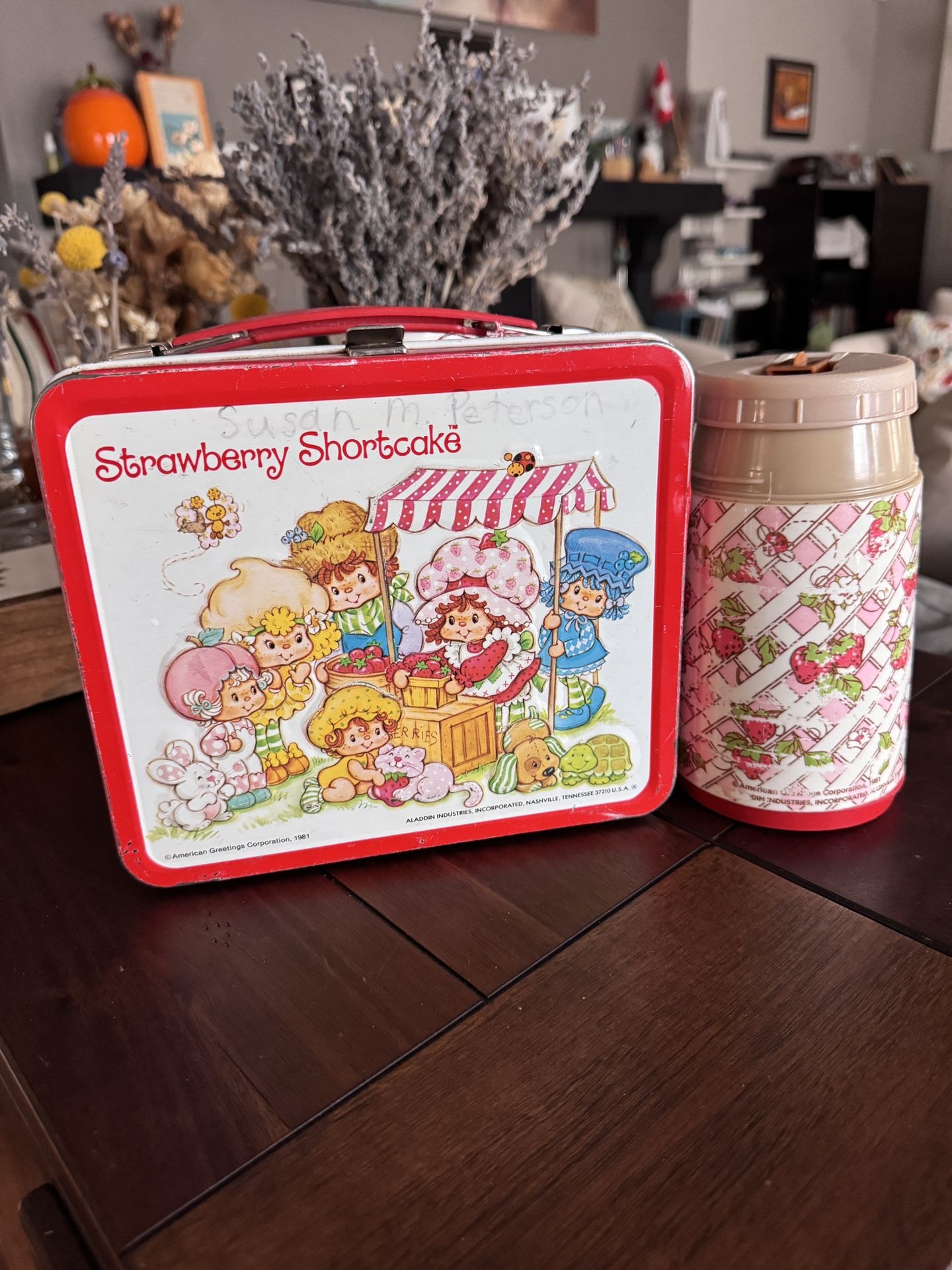 Pickup Tempe AZ Broadway/101 Shipping also available Vintage metal strawberry shortcake lunchbox wirh thermos 1981 *please note the faintly written name on the lid* Thermos is missing red cap Antique Vintage Collector Collectible