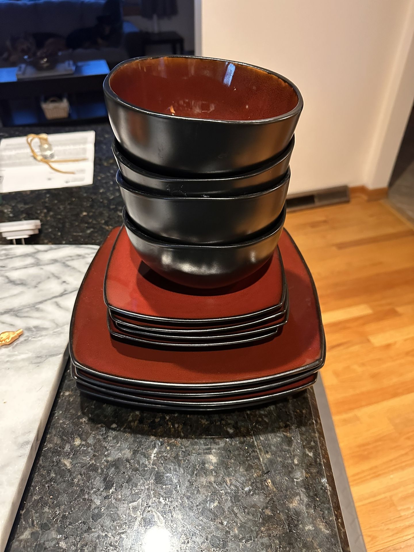 Selling a 12 pc bowl and plate set. Overall in good condition. There is one plate that has a chip unfortunately (see pic) bought this set a Macys a couple years ago. Cash and local pickup only.