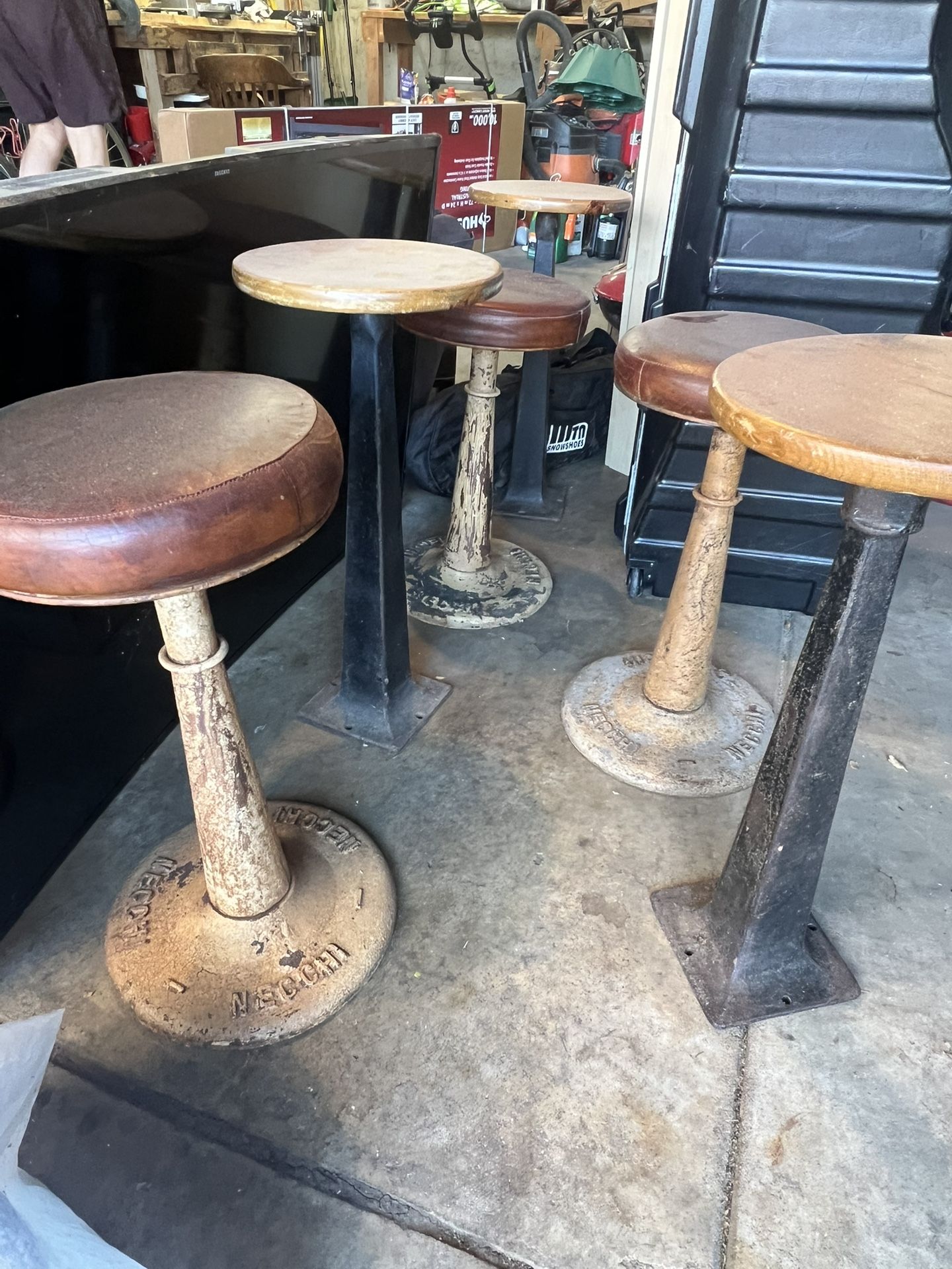 3 adjustable stools with leather seats. Italian industrial stools from early 1900s. 3 fixed height stools with wood seat. Will sell them 3-3 or all 6.