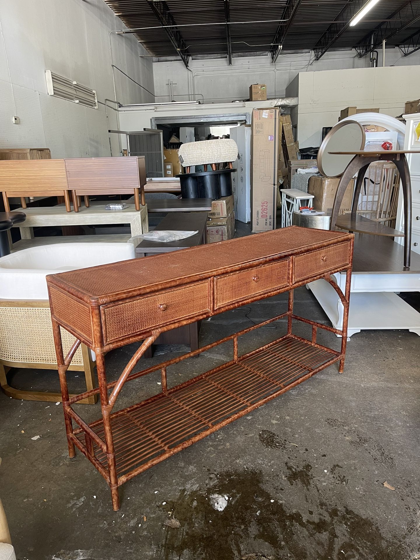 Selling new only asking $325 Original Price $700 Dimensions (prominent): Overall: 61.40" W x 16.90" D x 34.00" H Handwoven natural rattan surfaces for coastal, light-filled texture — each piece varies slightly due to natural material Marbled tortoise finish adds depth and visual interest from every angle Durable construction: natural rattan combined with engineered wood for stability and longevity Three roomy drawers with round knobs provide secure storage for essentials; wide tabletop and lower shelf offer generous display space Fully assembled