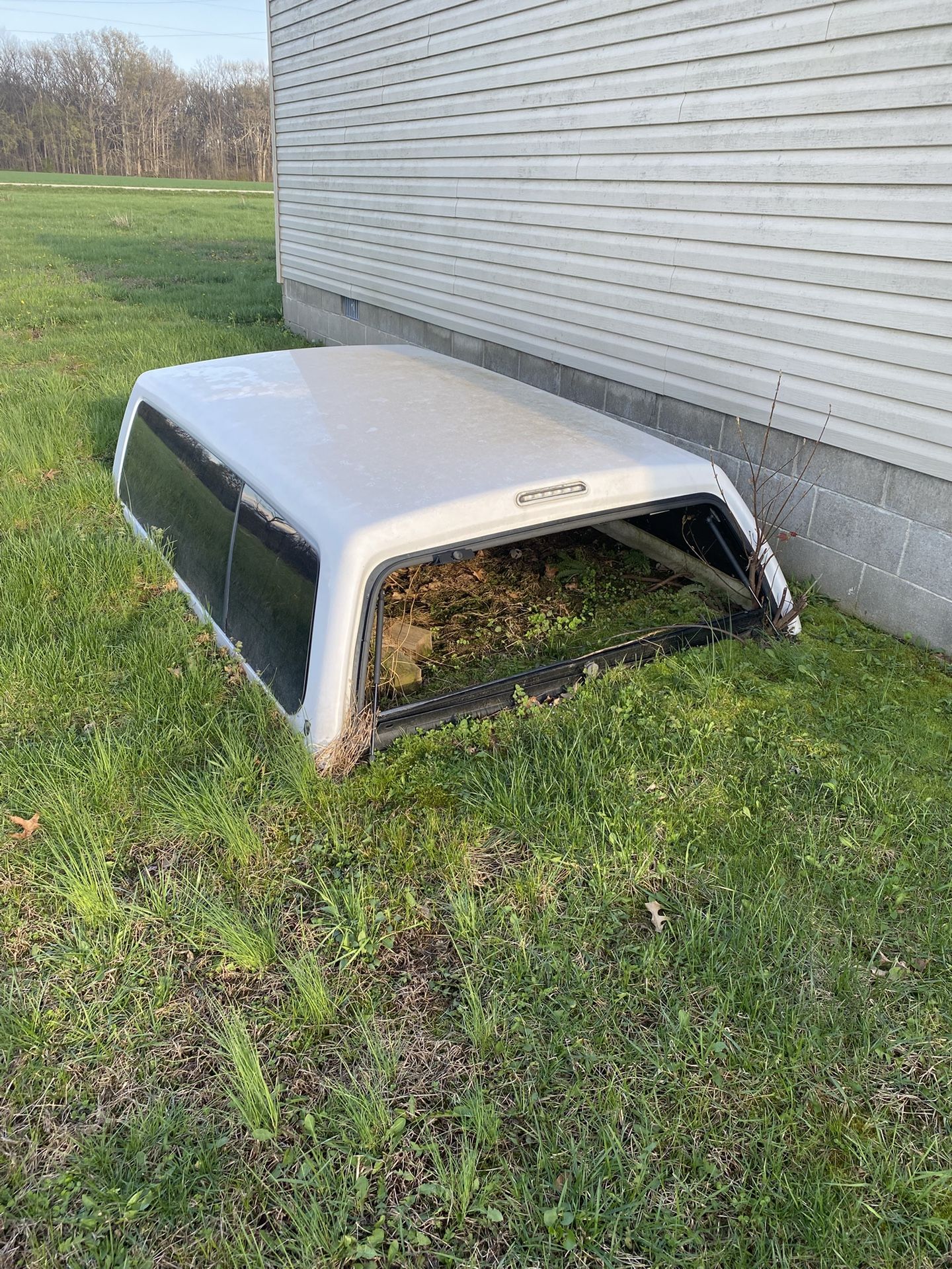 White camper shell fits dodge Ram 2004-2009 full size 8 foot bed, needs back window replacement, in good condition with tie downs. Asking 575.00 obo. (contact info removed)