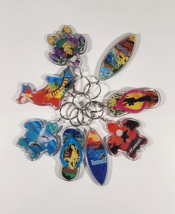 LOT OF 8 VINTAGE HAWAIIAN ISLANDS HAWAII TROPICAL KEYCHAINS TURTLE SURF SANDAL