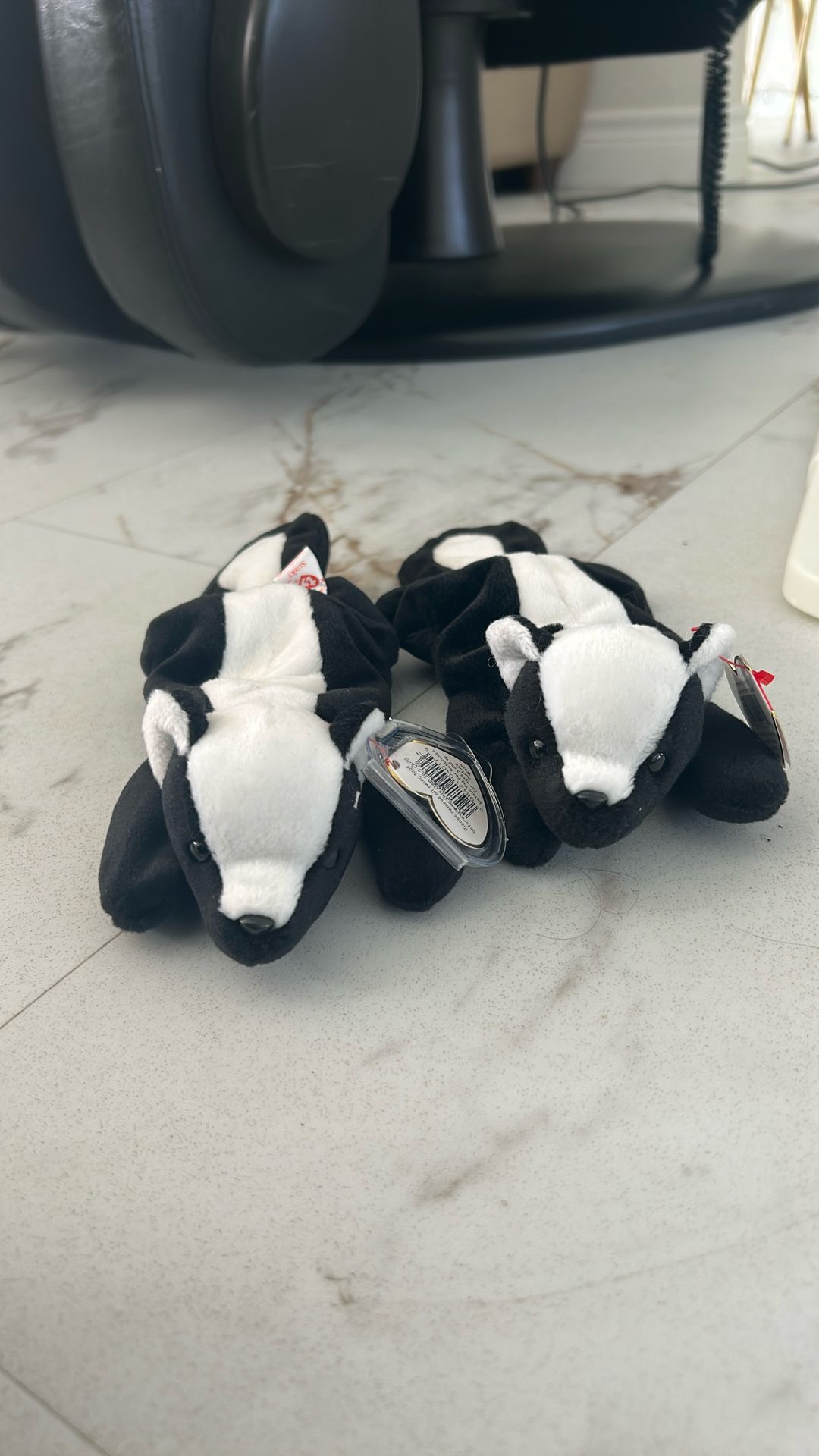 stinky the skunk, ty beanie babies. in intact condition, tag still protected and untouched. all have tags. 6 for EACH or 12 FOR ALL OR BETTER OFFER. need gone asap