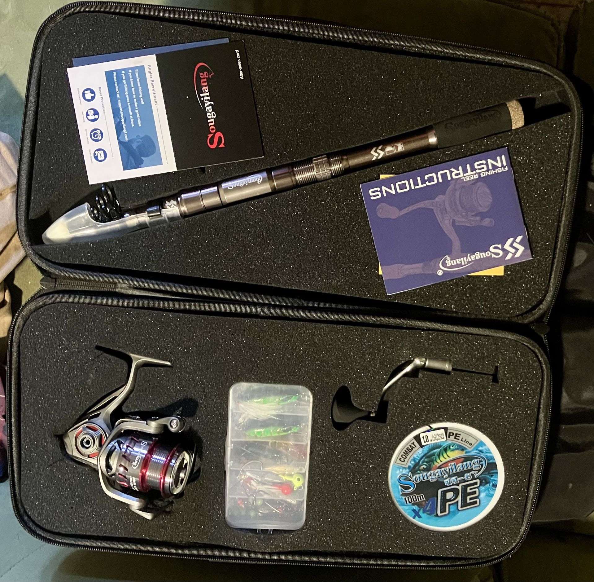 White weight, fishing pole, collapsible, plus real plus fishing line and a small tackle box. All inside a lightweight case brain handle.. Brand new never used been sitting in case with my camping gear brand new condition