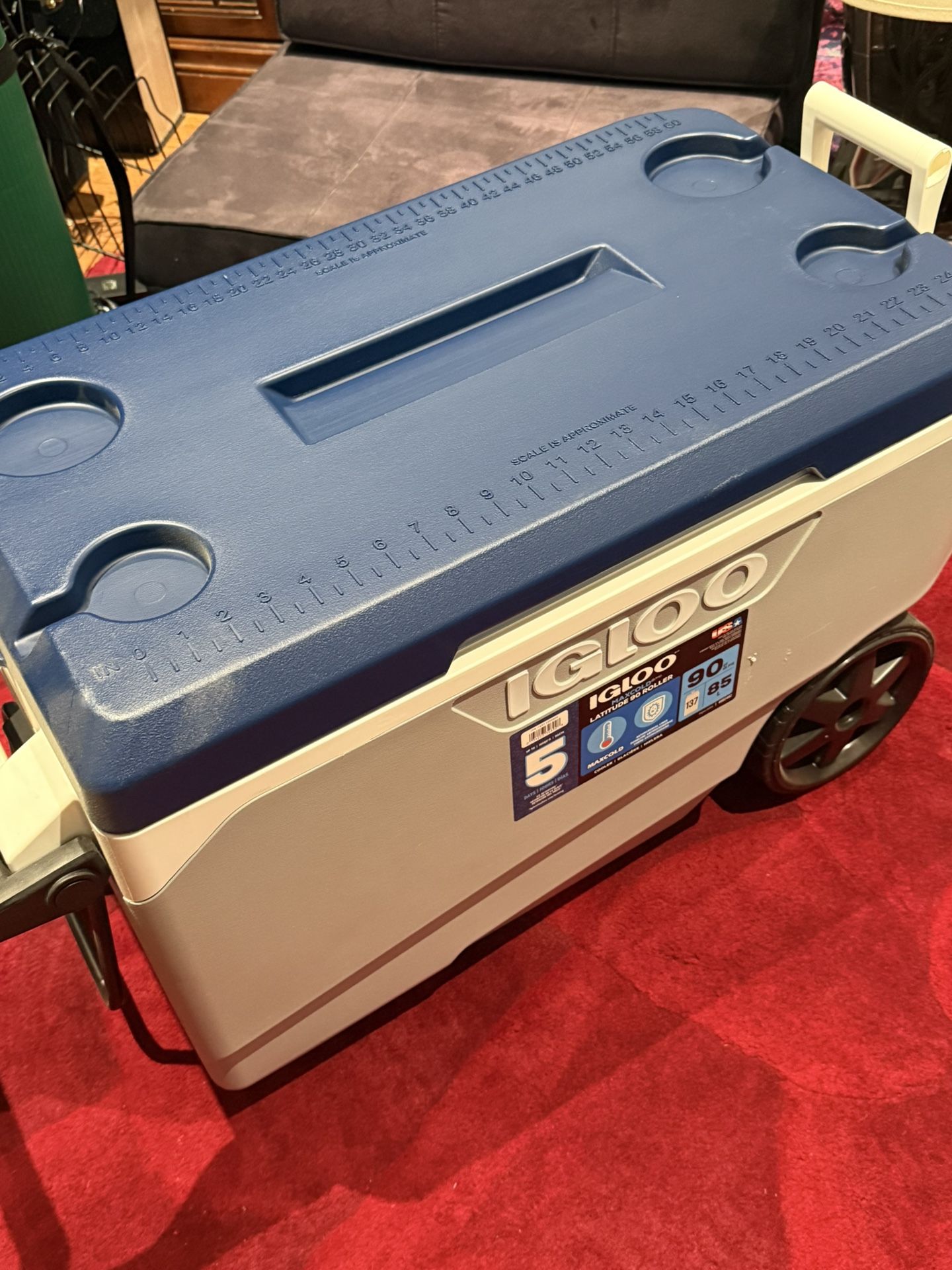 This heavy‑duty Igloo MaxCold Latitude 90qt roller cooler offers up to 5 days of ice retention, making it perfect for camping, fishing trips, tailgates, and beach days. It features a durable insulated body and lid, smooth‑rolling wheels, a sturdy pull handle, and a molded ruler on top for convenience. Holds up to 137 cans and is made in the USA with global components. Clean, reliable, and ready for your next outing. Located in UTC close to the mall, La Jolla, 9037.