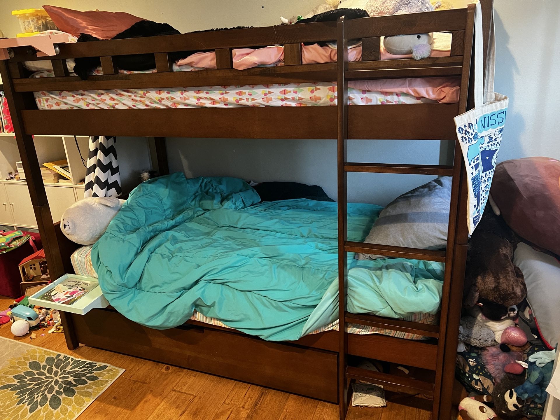 Very solid bunk bed set. Good used condition. Clean mattresses included. Our loss is your gain. Price includes both bunks, mattresses and ladder