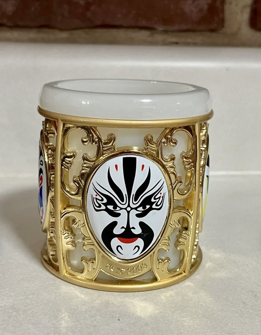 Ornate Chinese Opera Mask Holder Vintage, In perfect condition, serves as a cultural decorative collective item, often used as a pen or brush holder. Designed with traditional Peking opera patterns and decorative gold-colored metalwork. Only asking $40 OBO FLEXIBLE PRICE, MAKE AN OFFER