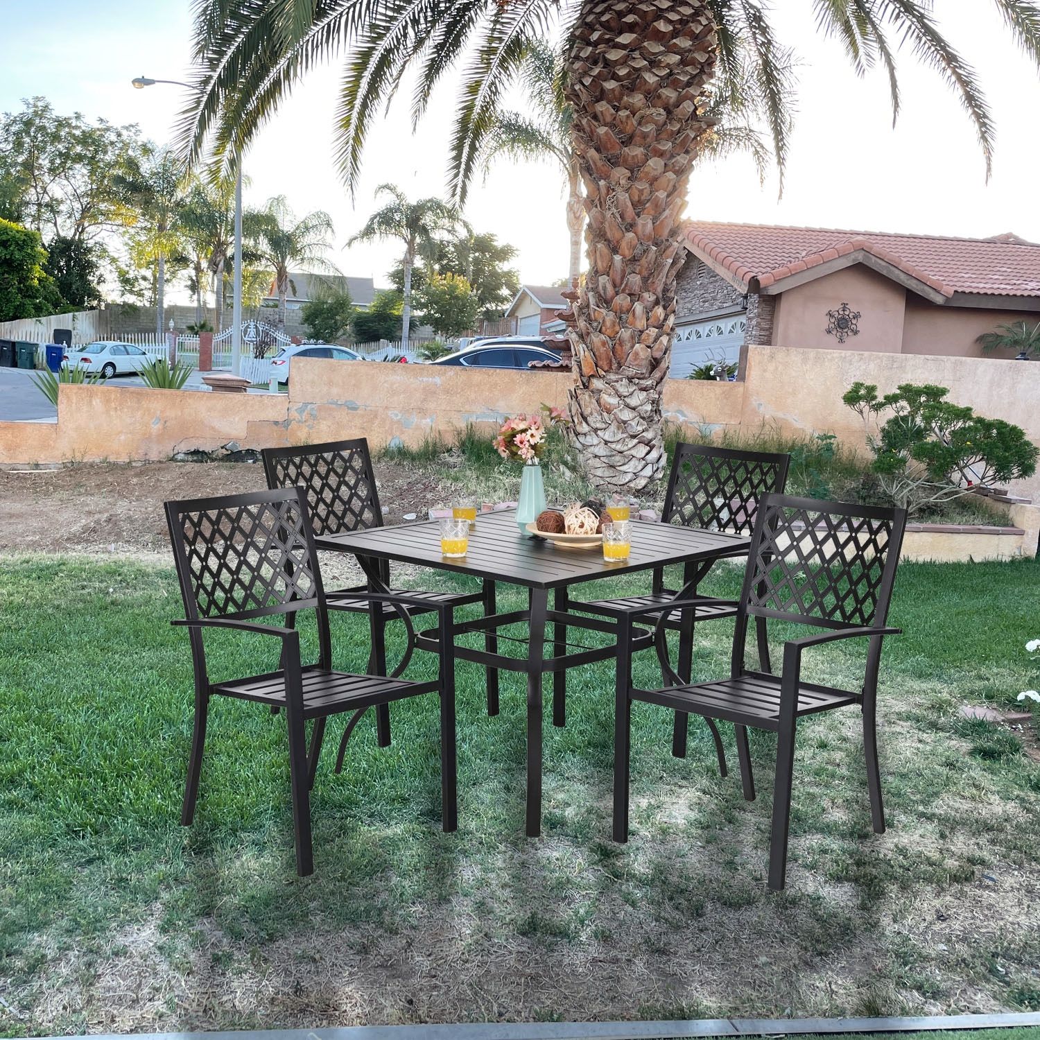 5 Pieces Outdoor Patio Dining Set, 37"x37" Metal Bistro Table with Umbrella Hole and 4 Metal Chairs for Poolside, Backyard, Balcony, Garden, Deck, Black Sturdy Construction: Selected anti-rust coated steel frame and solid construction ensure years of service life, no special maintenance required Table Size: Overall Dimension: 37"L x 37"W x 28"H Diameter of umbrella hole:1.57" Chair size: Overall Dimension: 25"L x 22.5"W x 35"H Seat height: 16.5" Weight capacity: 300LBS Patio dining set including 1 bistro table & 4 backyard chairs. Spacious chair and table comfortable for four or more person family dinner and party Stackable for space saving, can be used on the balcony, Poolside, Backyard, Balcony, Garden, Deck