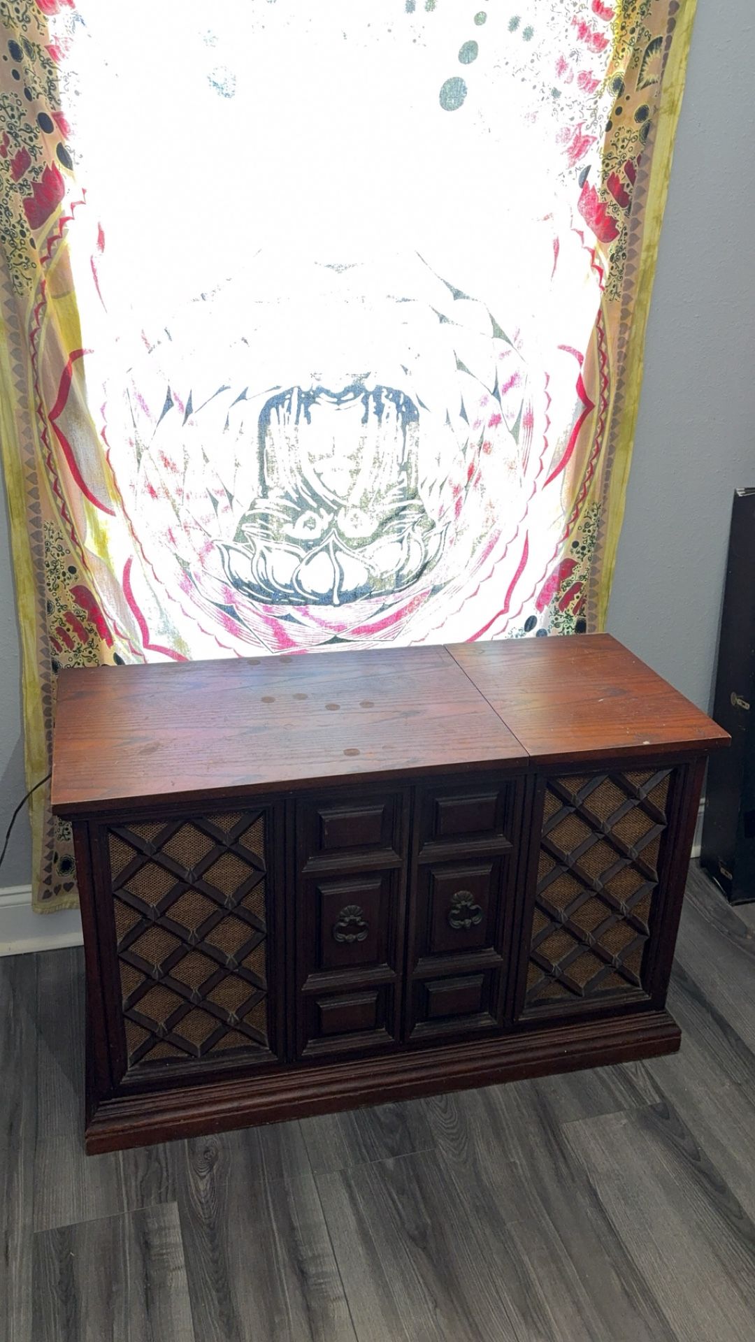 This antique record player is very attractive but it has NO RECORD PLAYER but the radio DOES work as shown in the video ! 40" wide, 17 1/2 deep & 25" tall! Good size for any front room or living room! Algiers 70131 pick up! Feel free to ask any questions.