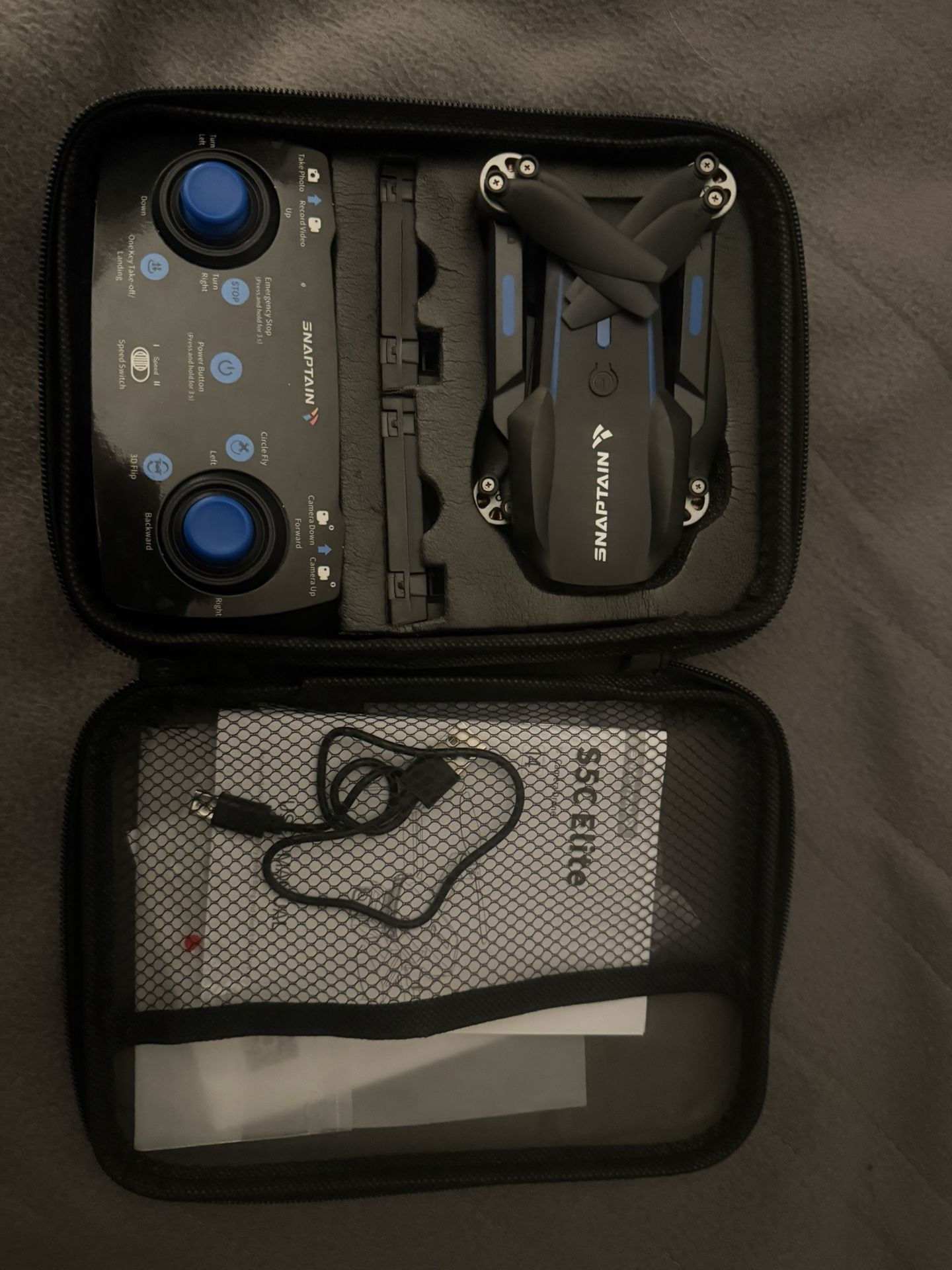 Flown one time for 10 minutes. Comes with 2 batteries, charging cable, and replacement blades. Perfect beginner drone.