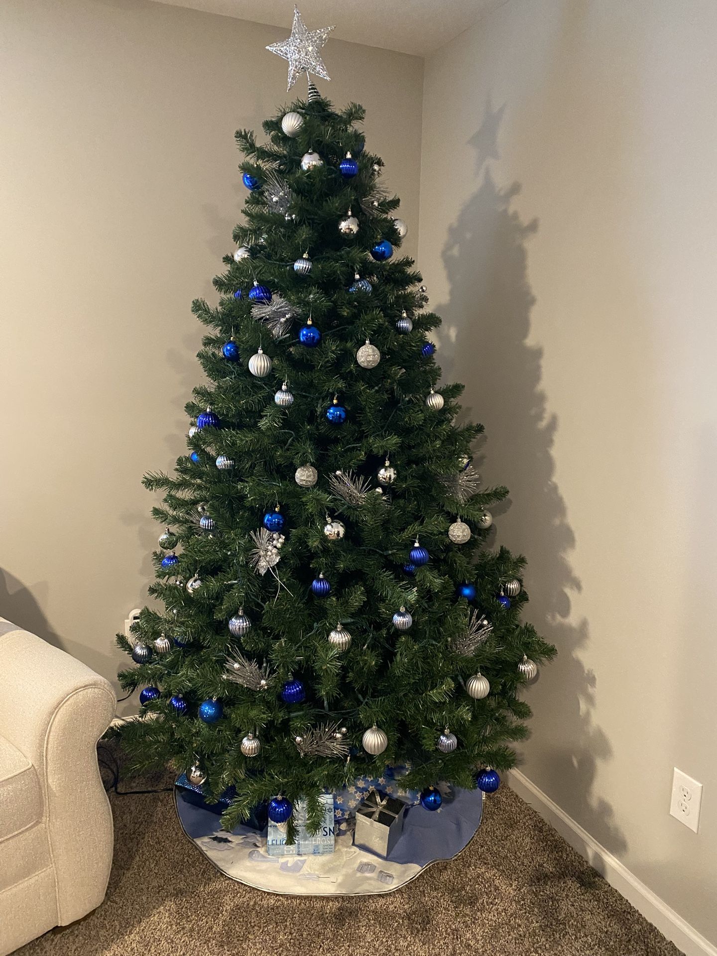 7.5 foot artificial tree. Comes in 3 separate pieces. Fold up/down hinged branches. Includes silver/blue ornaments. Silver glitter picks. Tree skirt and stand. NO lights. Canvas storage bag. Excellent conditions. Downsizing so no room. Cash on pick up.