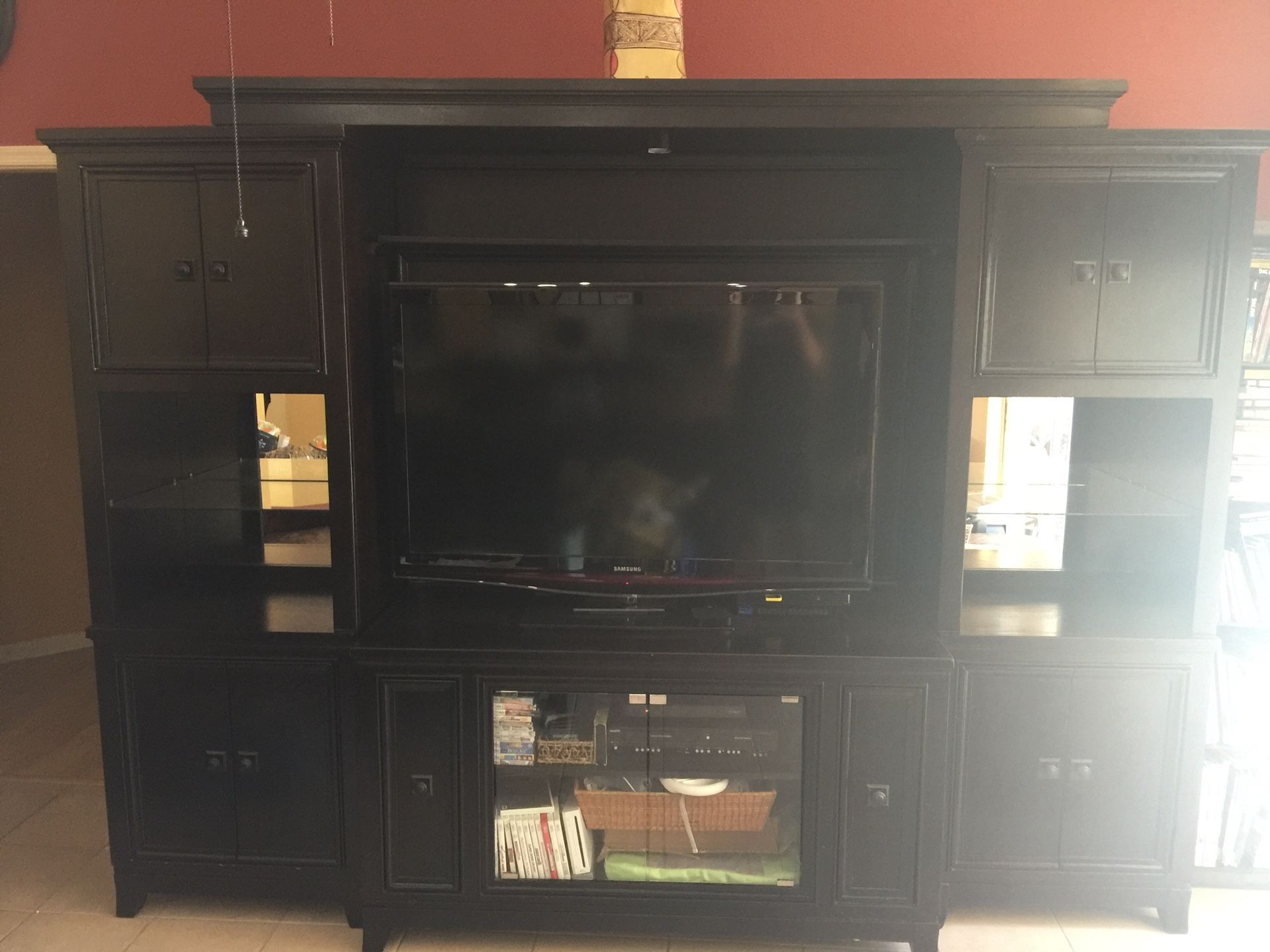 Espresso solid wood wall unit (4 pieces) with entertainment cabinet and dvd/vhs storage. 7ft tall, 9’7” wide, 1.5/1.9 deep. holds over 240 DVDs/60 vh