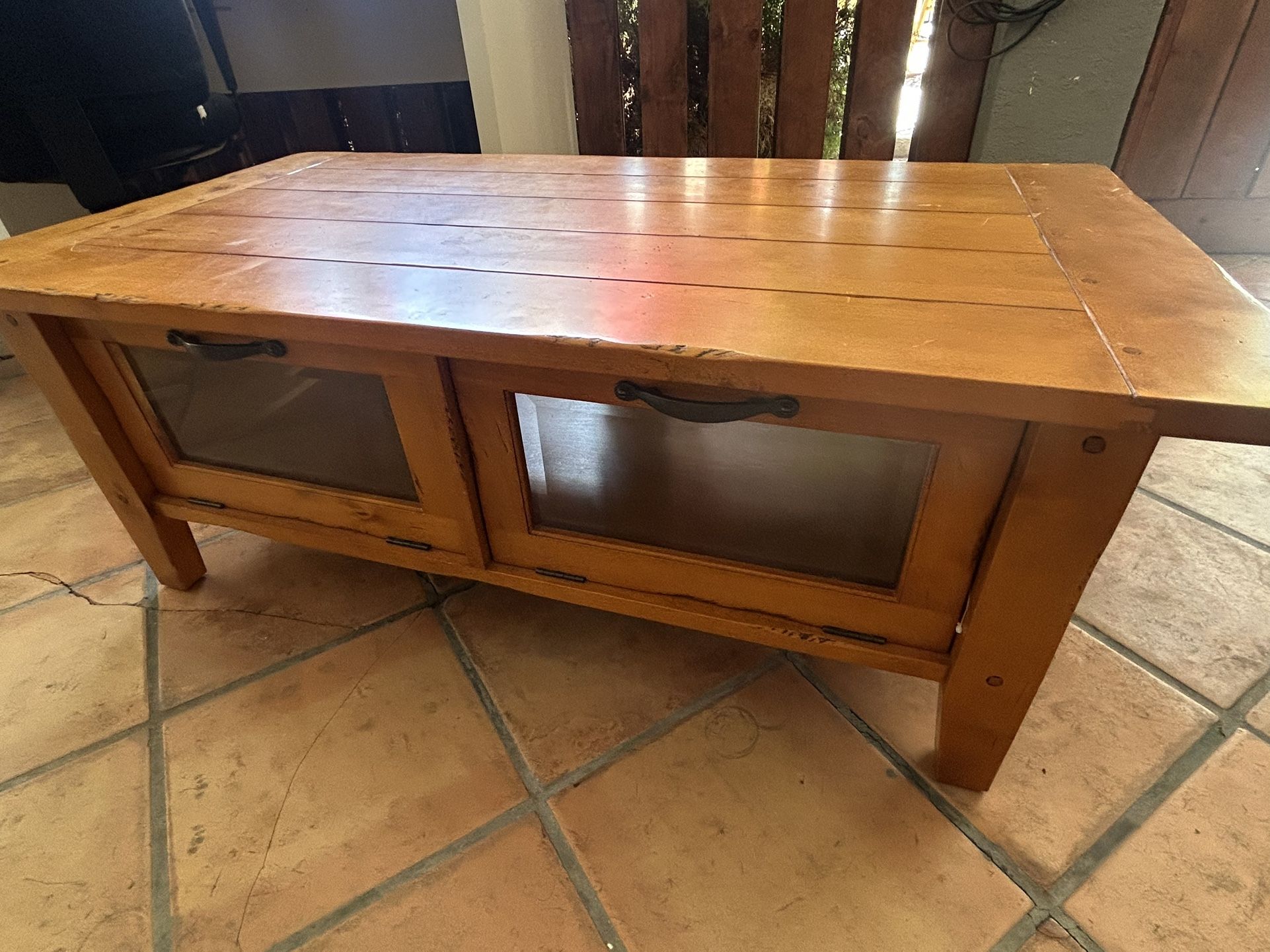 Beautiful wood coffee table. I believe it’s pine wood. In very good shape. Has four doors that open. Magnetics hold the doors close. on one of the doors one screw is missing. I’ll try to replace it if I get time but other than that it’s a 9.3/10 scale!