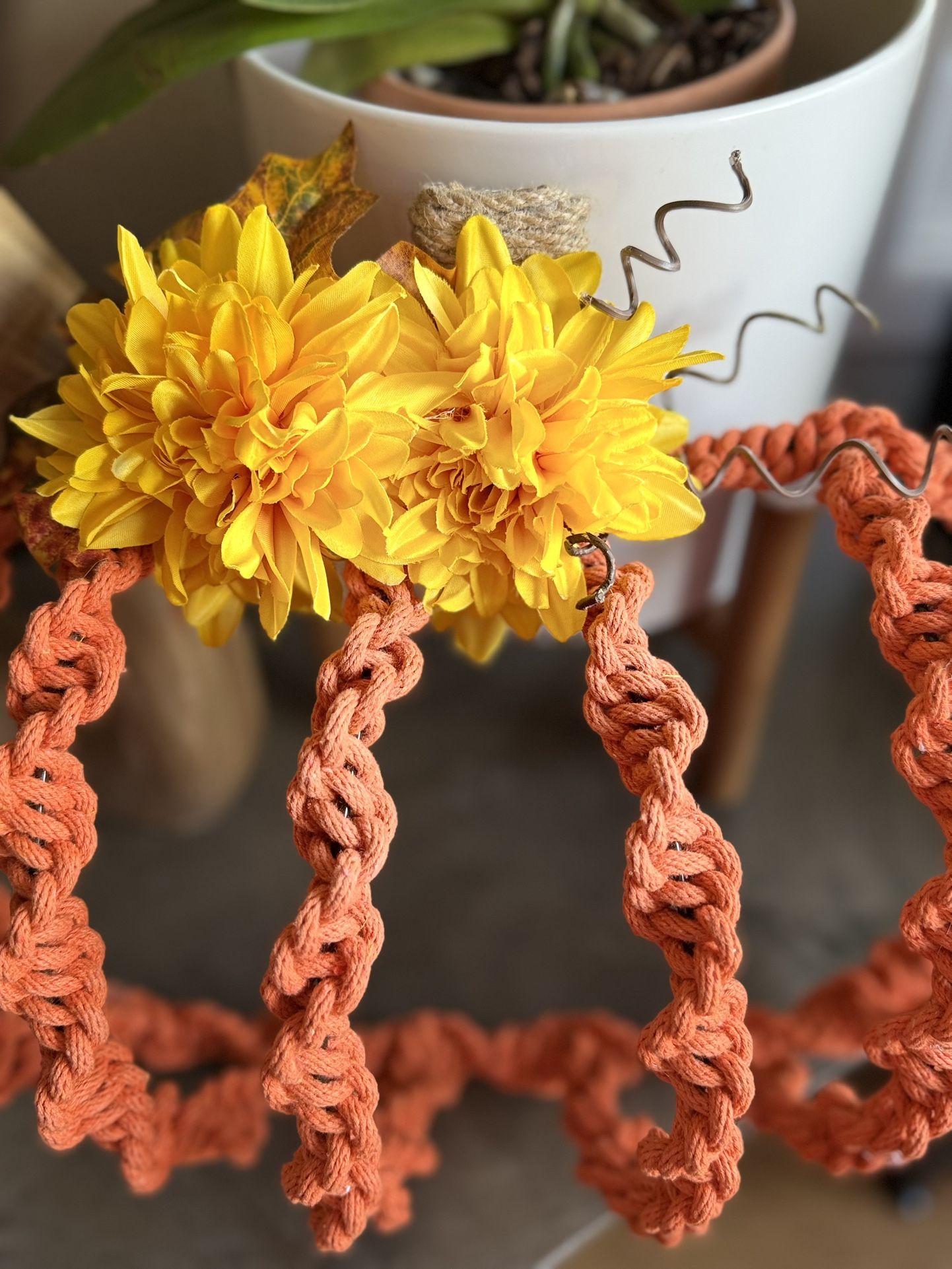 π Bring cozy autumn vibes into your home with this handmade macrame pumpkin! β’ Size: 16.5β W x 13β H x 6β D β’ Material: Cotton braided orange rope, wrapped around a sturdy wire pumpkin frame β’ Decorated with bright faux flowers for a warm seasonal touch β’ Lightweight and easy to display on mantels, entryways, shelves, tables or doors β’ Perfect for fall, Thanksgiving, or as a thoughtful handmade gift π β¨ Handcrafted with care.