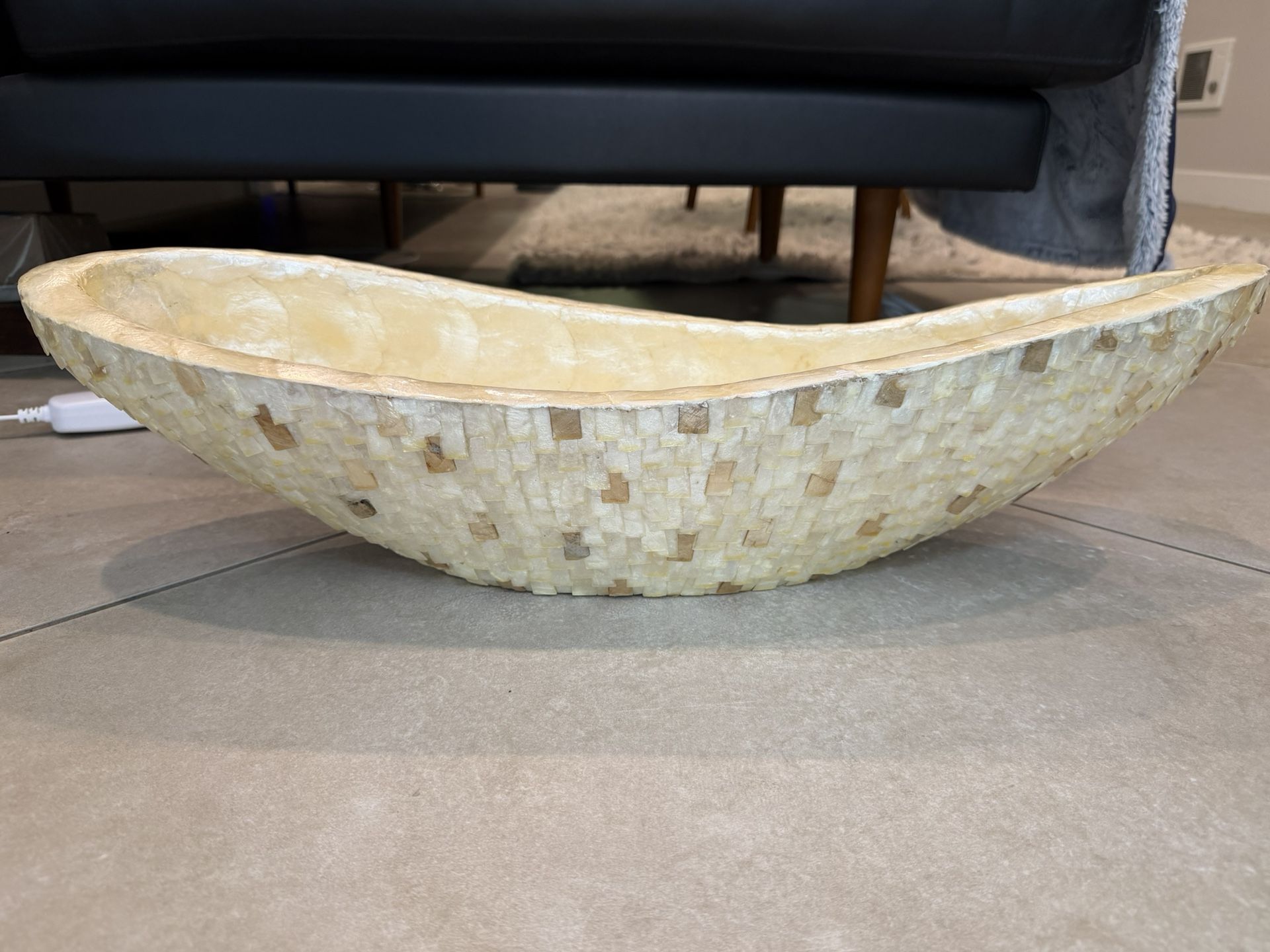 Large decorative bowl with a glossy, mother-of-pearl–style inlay look. Handcrafted appearance with iridescent detailing throughout. Beautiful as a centerpiece, fruit bowl for dry items, or decorative accent on a table or console. Material appears to be mother-of-pearl–like inlay over a solid base (exact material unknown). Intended for decorative use or dry contents only. • Approximate size: 25” x 8.75” • Finish: glossy, iridescent inlay look • Use: decorative or dry items • Condition: very good Care: wipe clean with a soft, damp cloth. Avoid dishwasher, microwave, or extreme heat. Pickup in Santa Monica. Message with any questions. Check out my other listings!