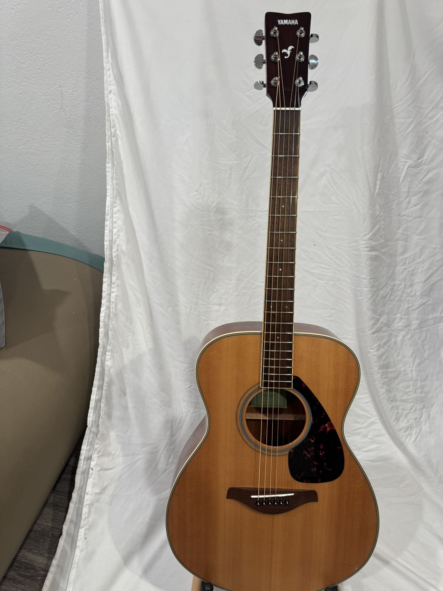 2016 Yamaha FS-820 acoustic guitar Serial # jp 130137 This is a gently used guitar , with a small body , perfect action, brand new Light D’Addario strings. Professionally set up by Pay it Forward music . Well balanced, mid range , bright tone. One ding on top, (picture) and scratch on back . Great for a smaller person . Thank you for your interest. 🔎 General Specs & Woods (Typical for FS-820) * Body shape: Concert / small-body acoustic — easier to hold than dreadnought. * Top wood: Solid spruce — gives a clear, balanced tone with good resonance. * Back & sides: Mahogany — warm midrange and punchy response. * Neck: Nato (a mahogany-like wood) — sturdy, balanced tone. * Fingerboard & bridge: Rosewood (or sometimes walnut) — traditional, smooth feel and tone * Scale length: ~25″ (634 mm) — typical acoustic scale. * Nut width: ~43 mm (1 11/16″). * Frets: 20 medium. * Tuners: Die-cast, chrome. * * Bracing: X-bracing / scalloped X-bracing — helps with volume and balance. * Finish: Gloss body, matte neck * The FS-800/820 series was introduced around 2016 as part of Yamaha’s FG/FS 800 line. * This version of the FS-820 (solid spruce top with mahogany back/sides) continued through the late 2010s into early 2020s Musicians endorsed by Yamha acoustics Joe Bonamassa Blues/roots guitar powerhouse. Yamaha shows him in their artist section with Yamaha acoustic and acoustic-electric models (like LJX/LL series acoustics). Don Alder Champion-level fingerstyle guitarist with a Yamaha endorsement among his gear lineup. Very entertaining and technical acoustic live performer. Ed Sheeran (associated use) Not formally on Yamaha’s official artist roster, but widely cited as having used Yamaha acoustics early in his career and often linked with FG/FS models in artist discussions. John Denver, Bob Dylan, Paul Simon, James Taylor (historical use) These legend singer-songwriters have famously used Yamaha acoustics (especially custom or FG series instruments) in recordings and tours — not always formal endorsements, but strong historical association with Yamaha acoustics.