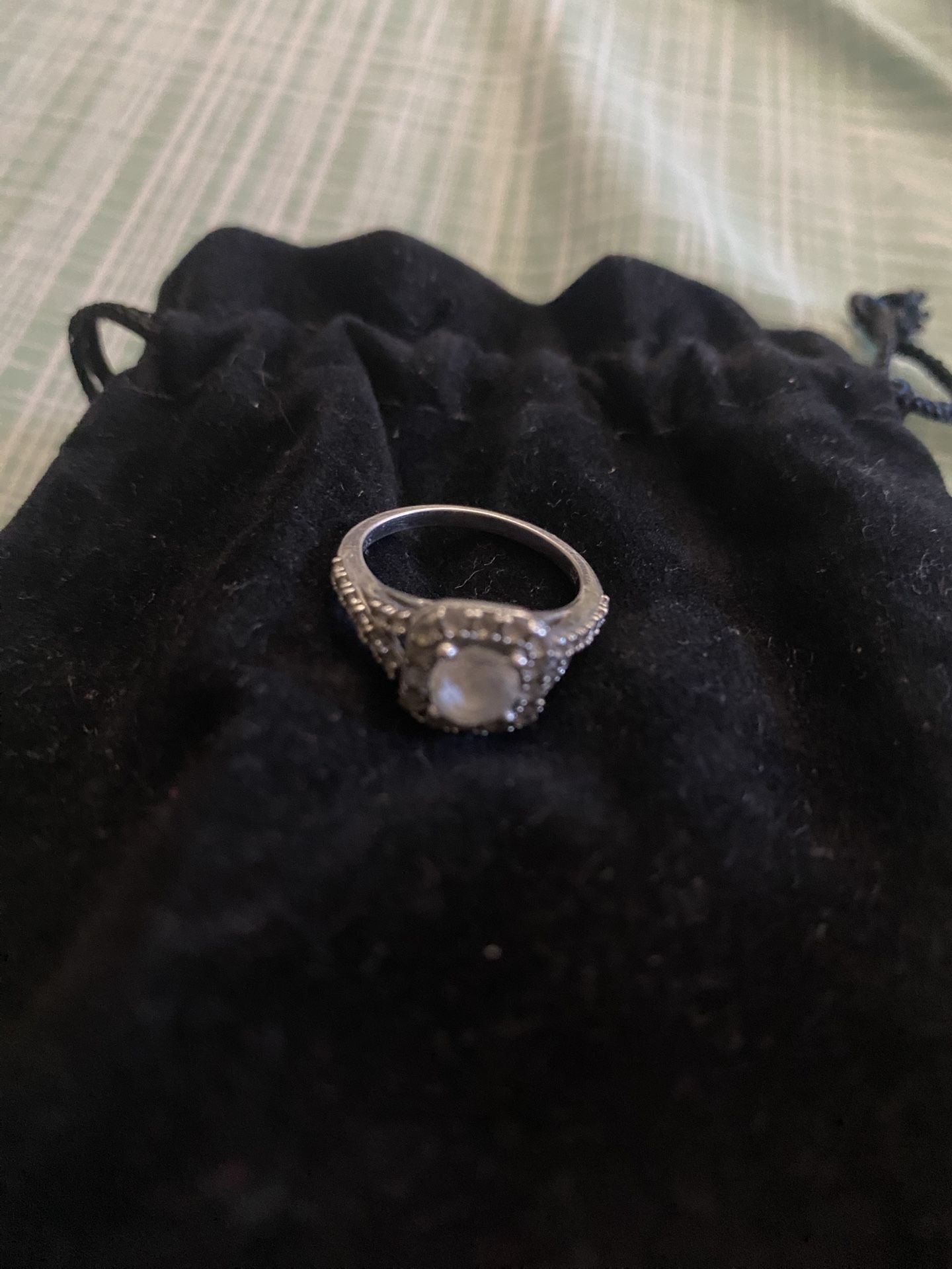 Size 7, white sapphire with diamonds inlaid. Sterling silver band.