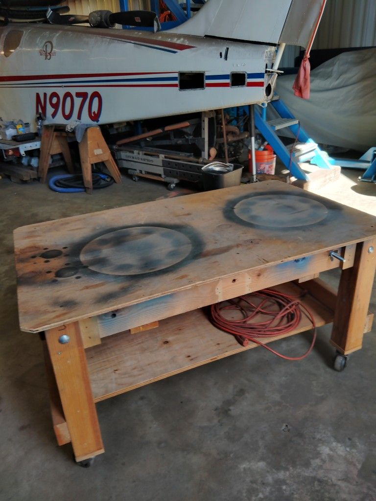 Nice rolling shop work bench Approx 4.5' wide x 3' deep x 2' tall 4 nice caster wheels Solid wood 4x4, 2x4 and plywood construction, with proper hardware. Paid a lot more in materials and labor to build this Located in El Cajon Thanks!