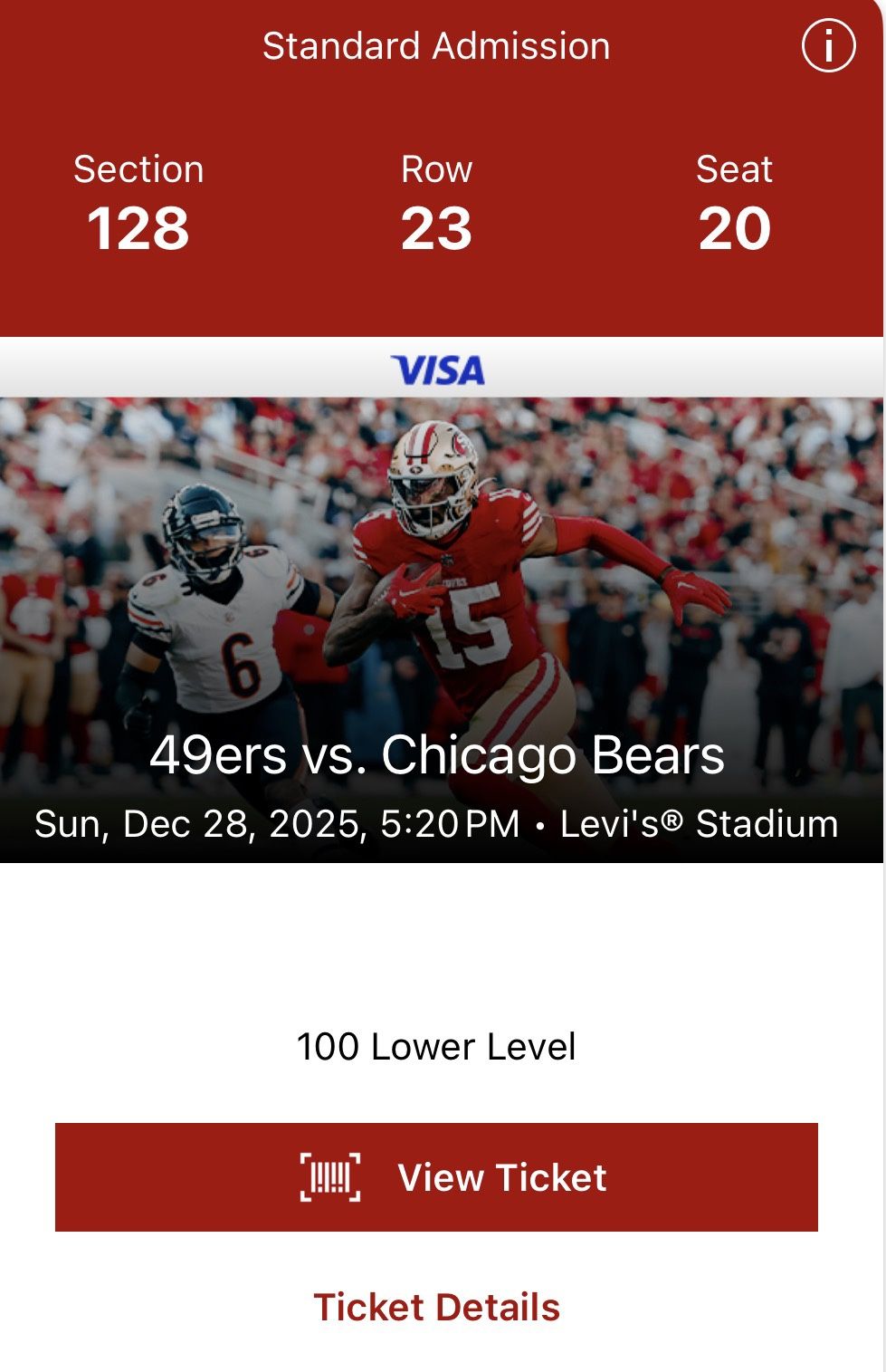 Selling 2 Tickets – 49ers vs Chicago Bears 📅 Sunday, Dec 28 @ 5:20 PM 📍 Levi’s Stadium – Section 128, Row 23, Seats 19 & 20 🔥 Great seats, great price, and an amazing view! 🔥 I’m a Season Ticket Holder (SBL), so these tickets also include FREE unlimited stadium food + non-alcoholic drinks from the season pass holder concession stand. Save $$$ on stadium food and enjoy the game worry-free! 💲 $500 per ticket (well below market for this). ✅ Ticketmaster transfer available. 💵 Payment options: Cash, Venmo, Zelle. 🤝 If you’re local, we can meet at a nearby bank for the exchange. Don’t miss this deal — lower-level 49ers tickets with food included are hard to beat!