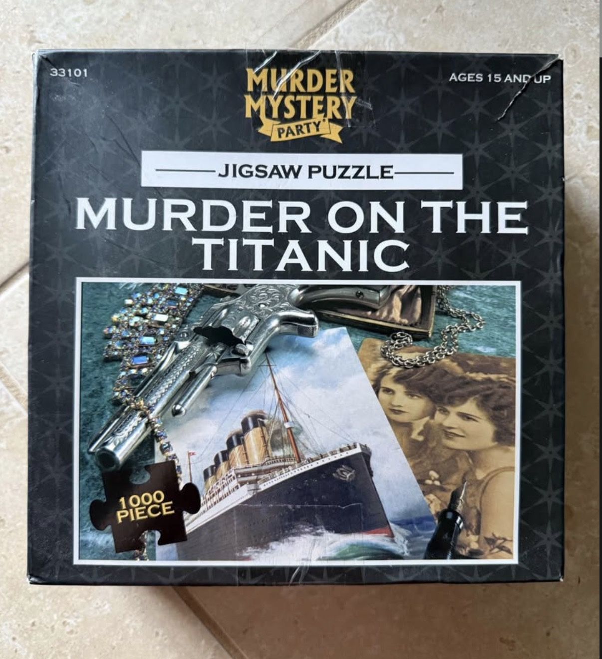 Mystery Jigsaw Puzzle is a 1000 piece puzzle that features a story about wealthy twin sisters who face romance, betrayal, and death on the Titanic. The puzzle is different from the box cover and players must piece together clues from the story and the puzzle to solve the murder.
